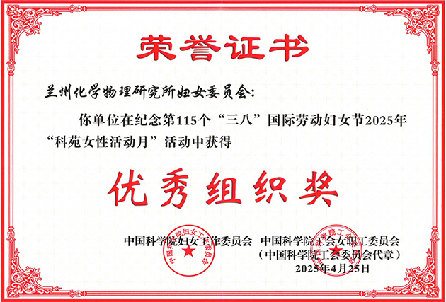 近日,中國(guó)科學(xué)院婦女工作委員會(huì)、中國(guó)科學(xué)院工會(huì)女職工委員會(huì)公布了2025年中國(guó)科學(xué)院“科苑女性活動(dòng)月”獲獎(jiǎng)名單。中國(guó)科學(xué)院蘭州化學(xué)物理研究所婦女委員會(huì)獲優(yōu)秀組織獎(jiǎng),也是連續(xù)三年獲得該榮譽(yù)。