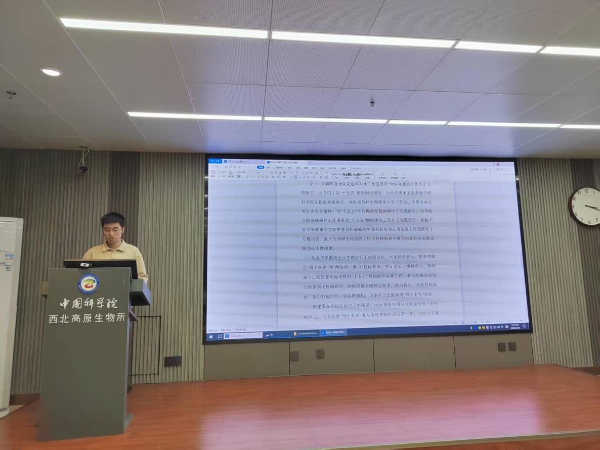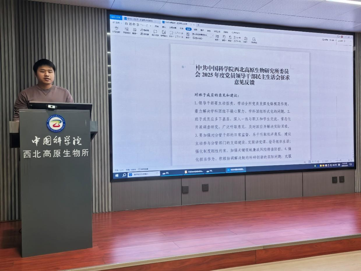 組織委員兼紀(jì)檢委員張昆領(lǐng)學(xué)了習(xí)近平在中共中央政治局第二十四次集體學(xué)習(xí)會議精神,通報(bào)了《中共中國科學(xué)院西北高原生物研究所委員會2025年度黨員領(lǐng)導(dǎo)干部民主生活會征求意見反饋》。