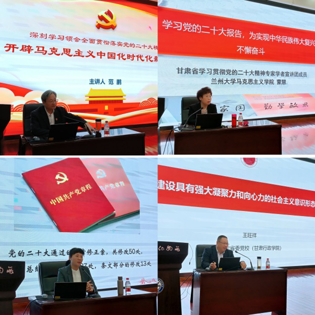 中共甘肅省委黨校文史教研部主任王旺祥教授,甘肅省委專(zhuān)家學(xué)者宣講團(tuán)成員、中共甘肅省委黨校黨的建設(shè)與領(lǐng)導(dǎo)科學(xué)教研部主任高璐佳,甘肅省學(xué)習(xí)貫徹黨的二十大精神專(zhuān)家學(xué)者宣講團(tuán)成員、蘭州大學(xué)馬克思主義學(xué)院蒙慧教授,甘肅省委專(zhuān)家學(xué)者宣講團(tuán)成員、蘭州大學(xué)范鵬教授分別應(yīng)邀作了題為“建設(shè)具有強(qiáng)大凝聚力和向心力的社會(huì)主義意識(shí)形態(tài)”“黨的二十大黨章修改的重點(diǎn)內(nèi)容及其重大深遠(yuǎn)歷史意義”“學(xué)習(xí)黨的二十大報(bào)告,為實(shí)現(xiàn)中華民族偉大復(fù)興不懈奮斗”“深刻學(xué)習(xí)領(lǐng)會(huì)全面貫徹落實(shí)黨的二十大精神 開(kāi)辟馬克思主義中國(guó)化時(shí)代化新境界”的報(bào)告。