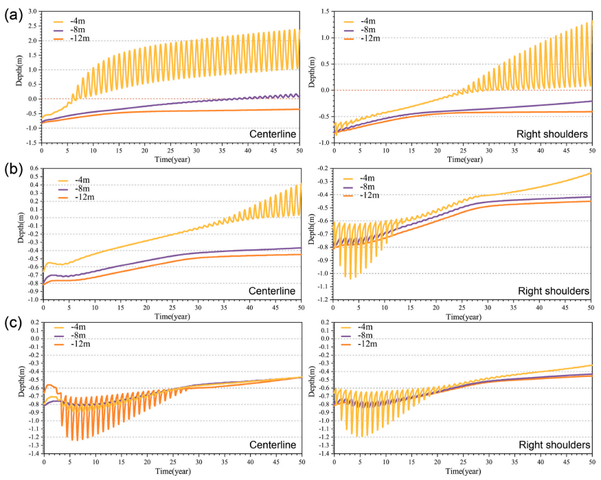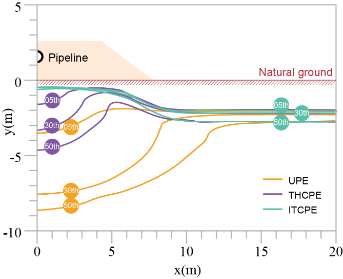 基于上述科學(xué)問題,中國科學(xué)院西北生態(tài)環(huán)境資源研究院科研團(tuán)隊(duì)研究提出一種新型倒T型碎石管道路堤(ITCPE)結(jié)構(gòu),該結(jié)構(gòu)基于“煙囪效應(yīng)”原理,利用管道自身熱量強(qiáng)化對流,可更有效地帶走管道熱量,冷卻凍土。此外,基于現(xiàn)場監(jiān)測系統(tǒng)的實(shí)測邊界,結(jié)合多孔介質(zhì)及相變理論,對ITCPE、無保護(hù)管道路堤(UPE)和傳統(tǒng)水平碎石管道路堤(THCPE)結(jié)構(gòu)在長期運(yùn)行過程中的熱效應(yīng)進(jìn)行了長期數(shù)值預(yù)測。研究結(jié)果表明,無論是有保溫層的埋地管道結(jié)構(gòu)、無防護(hù)的管堤結(jié)構(gòu),還是傳統(tǒng)的水平碎石管堤結(jié)構(gòu),都無法很好地解決中俄原油管線融沉問題。但新型ITCPE結(jié)構(gòu)可以有效減緩管道融沉問題,而且在管道運(yùn)營50年內(nèi)可顯著維持管堤下伏凍土的人為凍土上限高度。相關(guān)研究結(jié)果為中俄原油管線提供了技術(shù)支持,同時(shí)也為全球多年凍土區(qū)其他管道工程的設(shè)計(jì)和維護(hù)提供科學(xué)參考。