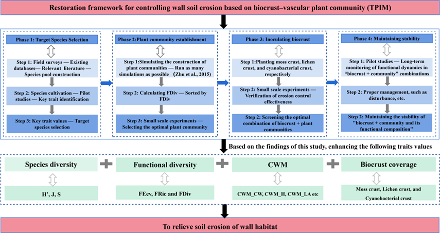 研究發(fā)現(xiàn),維管束植物物種豐富度、物種多樣性、功能豐富度、群落加權(quán)平均和苔蘚結(jié)皮蓋度由土長城遺址頂部向下部顯著降低,且與土長城兩側(cè)土體侵蝕程度呈負(fù)相關(guān)(圖1),表明土長城本體較高的區(qū)域有利于維管束植物和生物結(jié)皮的定殖和生長。同時(shí),維管束植物和生物結(jié)皮的協(xié)同作用能有效緩解遺址本體遭受風(fēng)雨侵蝕(圖2)?;诖?,研究人員提出了基于生物結(jié)皮和維管束植物群落構(gòu)建目標(biāo)物種選擇、植物群落構(gòu)建、生物結(jié)皮接種和維持群落穩(wěn)定等增強(qiáng)土長城抗侵蝕的“修復(fù)框架”(圖3),為土長城遺址本體侵蝕防治提供了新思路。