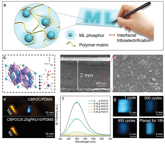圖1. Ca6BaP4O17:Ce3+/PDMS的復(fù)合結(jié)構(gòu)及摩擦/力致發(fā)光性能。