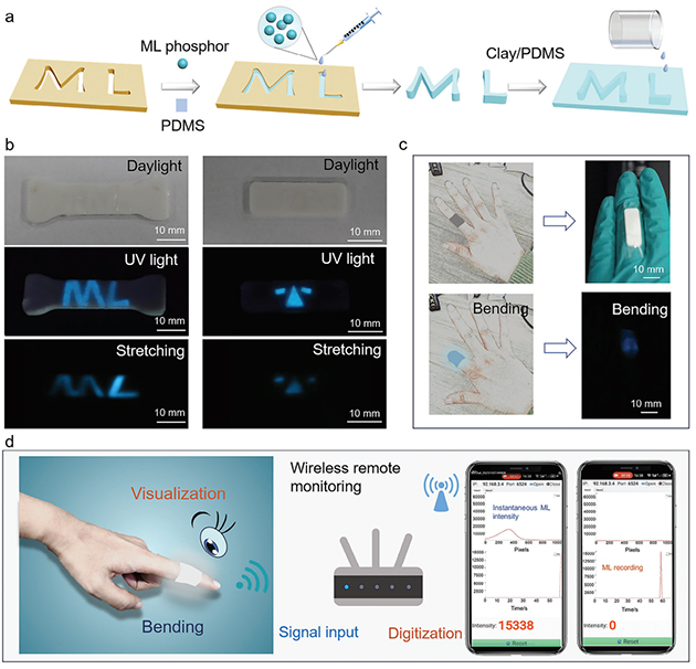 圖3. Ca6BaP4O17:Ce3+/PDMS材料在信息存儲和光子皮膚方面的應(yīng)用展示。