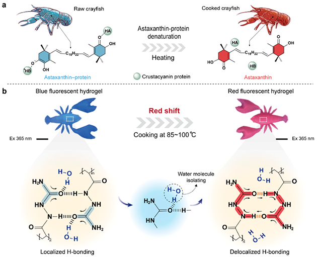 圖1. 蝦青素-蛋白質(zhì)加熱變性過(guò)程和受此啟發(fā)的熒光水凝膠制備機(jī)理