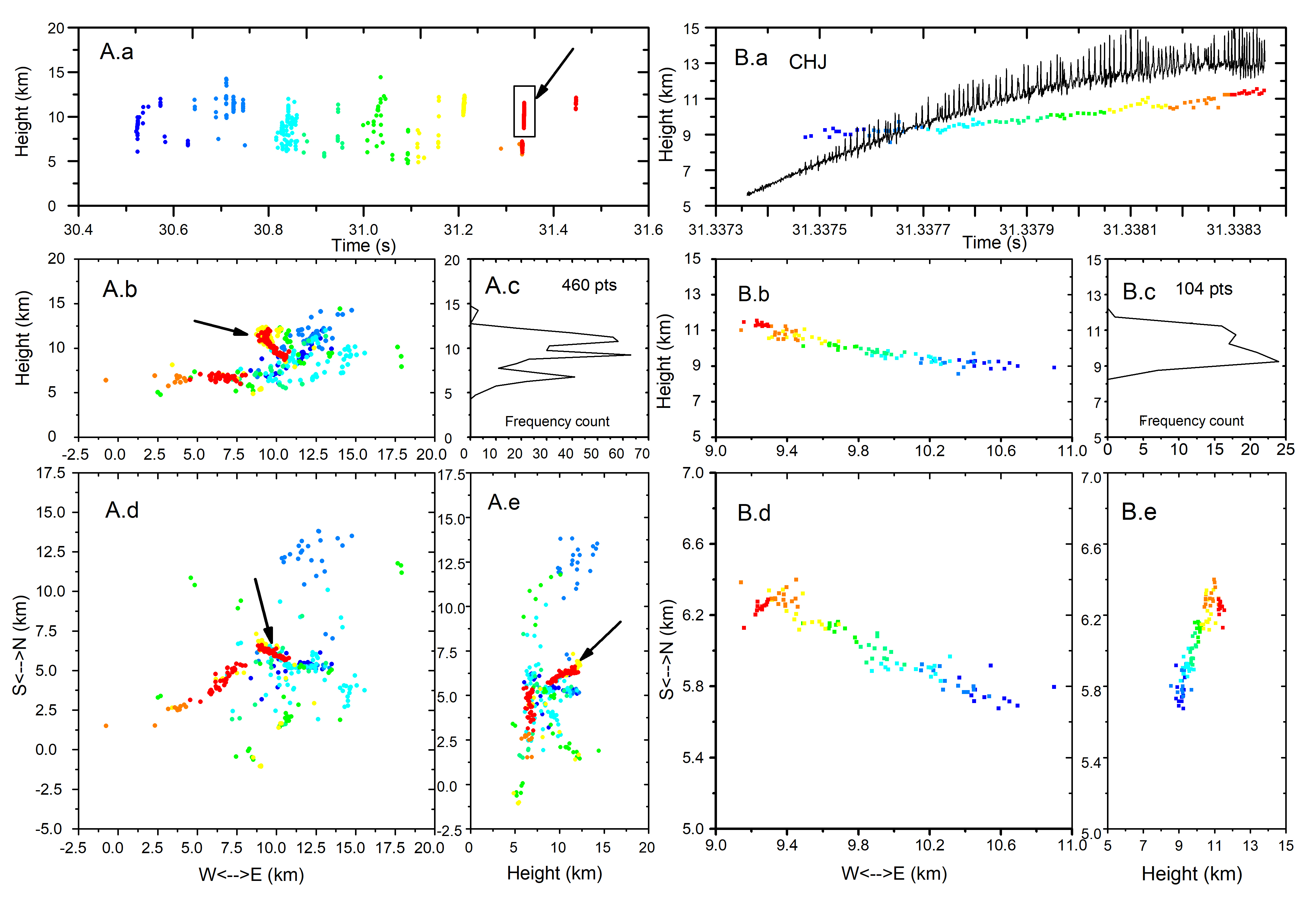 圖 1. 云閃(A)及其規(guī)則脈沖爆發(fā)序列?。≧PBs,B) 的三維觀測(cè)?。╝) 高度-時(shí)間關(guān)系圖,以及在CHJ站測(cè)量的LF/VLF電場(chǎng),該站作為坐標(biāo)原點(diǎn);(b) 東-西方向的垂直投影;(c) 輻射源數(shù)量及高度統(tǒng)計(jì)(RPBs 在 1 毫秒內(nèi)產(chǎn)生104脈沖);(d ,e) 平面圖和輻射源的南-北方向垂直投影(圖A出自 Fan 等 ,2018)。