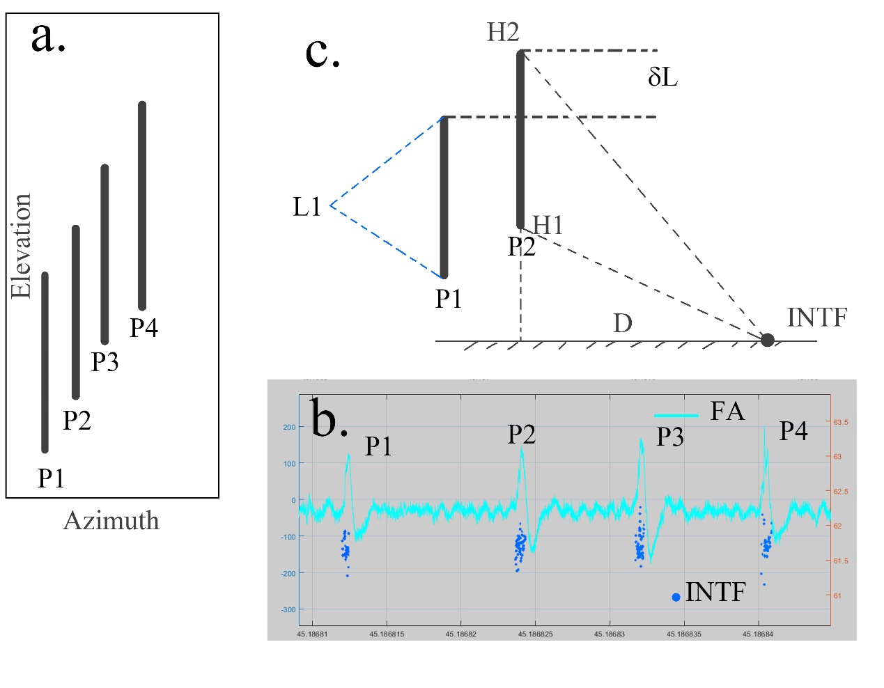 圖2. VHF干涉儀(Fan et al.,2023a;2023b)對(duì)規(guī)則脈沖爆發(fā)序列中連續(xù)脈沖的二維觀測(cè)結(jié)果,顯示這些脈沖比正常的直竄先導(dǎo)速度更快,并且從一個(gè)脈沖到另一個(gè)脈沖之間重疊較強(qiáng) (a)。從平面距離 D = 5.8 公里和干涉儀仰角的差異(例如,60.5° 和 60°),可以得出脈沖的 VHF輻射源的垂直范圍約為 205 米?。╟)。這一現(xiàn)象發(fā)生在約 2 微秒的時(shí)間間隔內(nèi),對(duì)應(yīng)的速度約為 108 米/秒。脈沖代表的擊穿速度遠(yuǎn)高于已知的閃電先導(dǎo)通道發(fā)展速度。