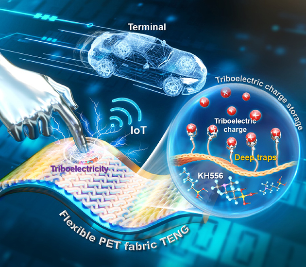 摩擦起電過(guò)程中產(chǎn)生的電荷會(huì)瞬時(shí)存儲(chǔ)在電介質(zhì)表面,進(jìn)而被兩種不同類(lèi)型的陷阱(淺陷阱和深陷阱)捕獲。其中,淺陷阱中的電荷容易逸出,優(yōu)先耗散到環(huán)境中,而深陷阱中的電荷則因?yàn)闃O難逸出,可長(zhǎng)期儲(chǔ)存。因此,影響摩擦層電荷耗散率的關(guān)鍵因素是陷阱捕獲電荷和被捕獲電荷的逃逸能力?;诖?,該團(tuán)隊(duì)通過(guò)系統(tǒng)研究,揭示了載流子深陷阱在摩擦電荷存儲(chǔ)中的機(jī)制,通過(guò)分子自組裝技術(shù)在織物摩擦層界面構(gòu)建載流子深陷阱的方式增加TENG的電輸出,將該織物TENG用于物聯(lián)網(wǎng)可穿戴電子設(shè)備的電源模塊,實(shí)現(xiàn)了對(duì)機(jī)械運(yùn)動(dòng)的穩(wěn)定控制。相關(guān)研究成果發(fā)表在Advanced Materials(2024,2303389)上。