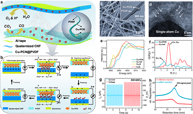 近日,研究團(tuán)隊(duì)與新加坡科學(xué)技術(shù)研究局的科研人員合作,在界面電荷利用方面做出新突破,利用單原子銅錨定的聚合物碳氮化物催化劑和季銨化纖維素納米纖維成功實(shí)現(xiàn)了接觸電催化CO2還原,生成CO的法拉第效率達(dá)到96.24 %。季銨化纖維素納米纖維由于含豐富的羥基,可在高濕度環(huán)境中與水分子形成氫鍵,固定水分子并參與接觸帶電并發(fā)生氧化反應(yīng),導(dǎo)致氧氣和質(zhì)子的產(chǎn)生,參與觸電催化CO2還原過(guò)程。這種方法在低濃度CO2環(huán)境中能高效地將其轉(zhuǎn)化為CO,為減少大氣CO2排放和推進(jìn)化學(xué)可持續(xù)性策略提供了一種解決方案。