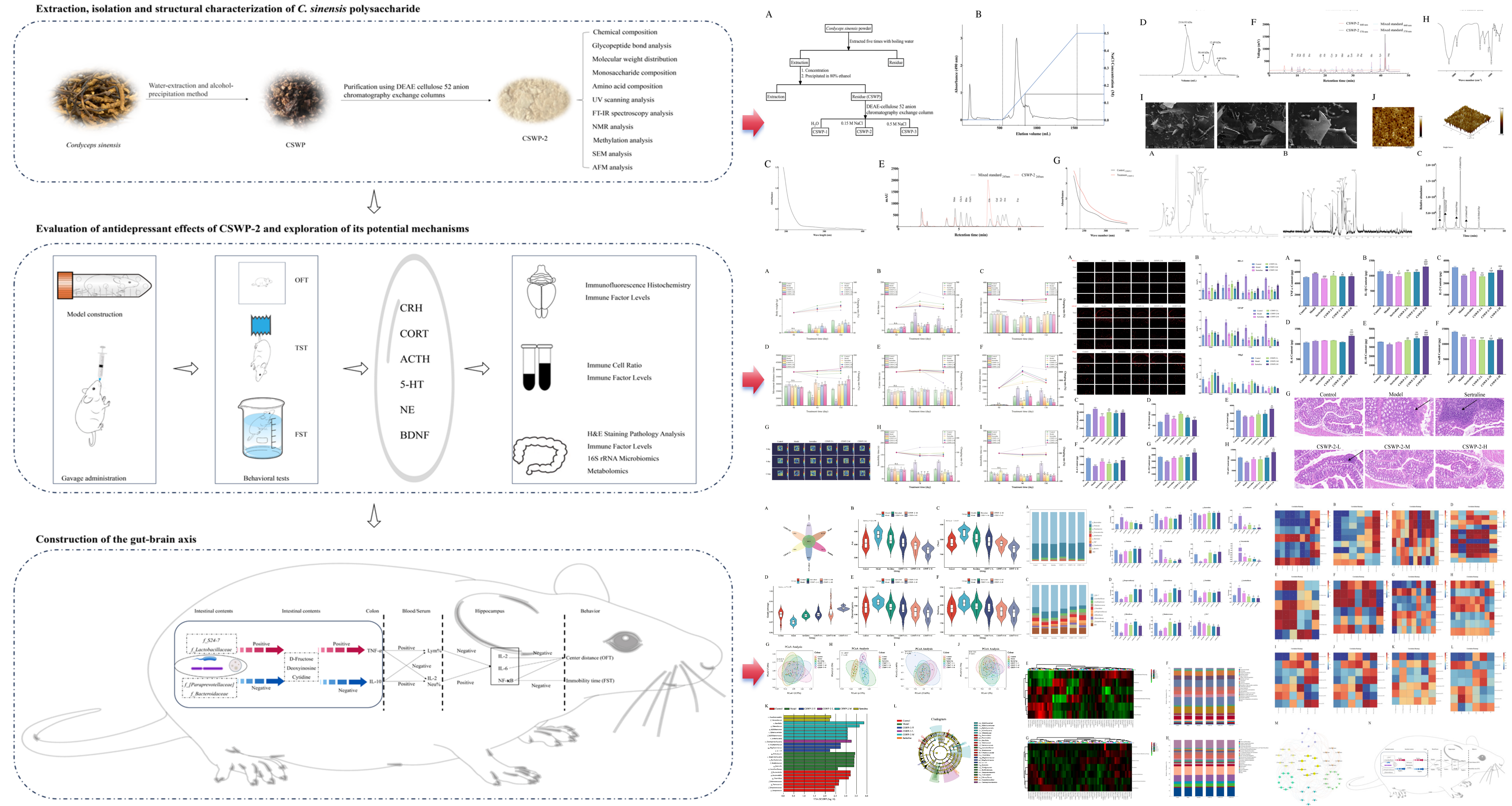 中國科學院西北高原生物研究所高原藏藥資源質(zhì)控與藥理毒理評價研究團隊采用水提醇沉法結(jié)合離子交換柱層析,從冬蟲夏草中得到一種CSWP-2多糖組分,隨后對其進行組成、結(jié)構(gòu)和抗抑郁作用研究。結(jié)構(gòu)研究結(jié)果表明,CSWP-2主要是由1,4-linked ??-D-Glcp、1,4,6-linked ??-D-Glcp、??-1,6-Galf和??-1,6-Manp等糖基連接組成??挂钟糇饔醚芯拷Y(jié)果表明,CSWP-2通過調(diào)整微生物群(f_S24-7,f_Lactobacillaceae,f_[Paraprevotellaceae]和 f_Bacteroidaceae)影響ABC轉(zhuǎn)運體信號通路,導致代謝物(D-fructose,deoxyinosine和cytidine)水平變化,從而調(diào)節(jié)機體的免疫水平,最終改善小鼠的抑郁樣行為。該研究為冬蟲夏草及其多糖成分在免疫調(diào)節(jié)及抗抑郁藥品研發(fā)中提供科學依據(jù)。