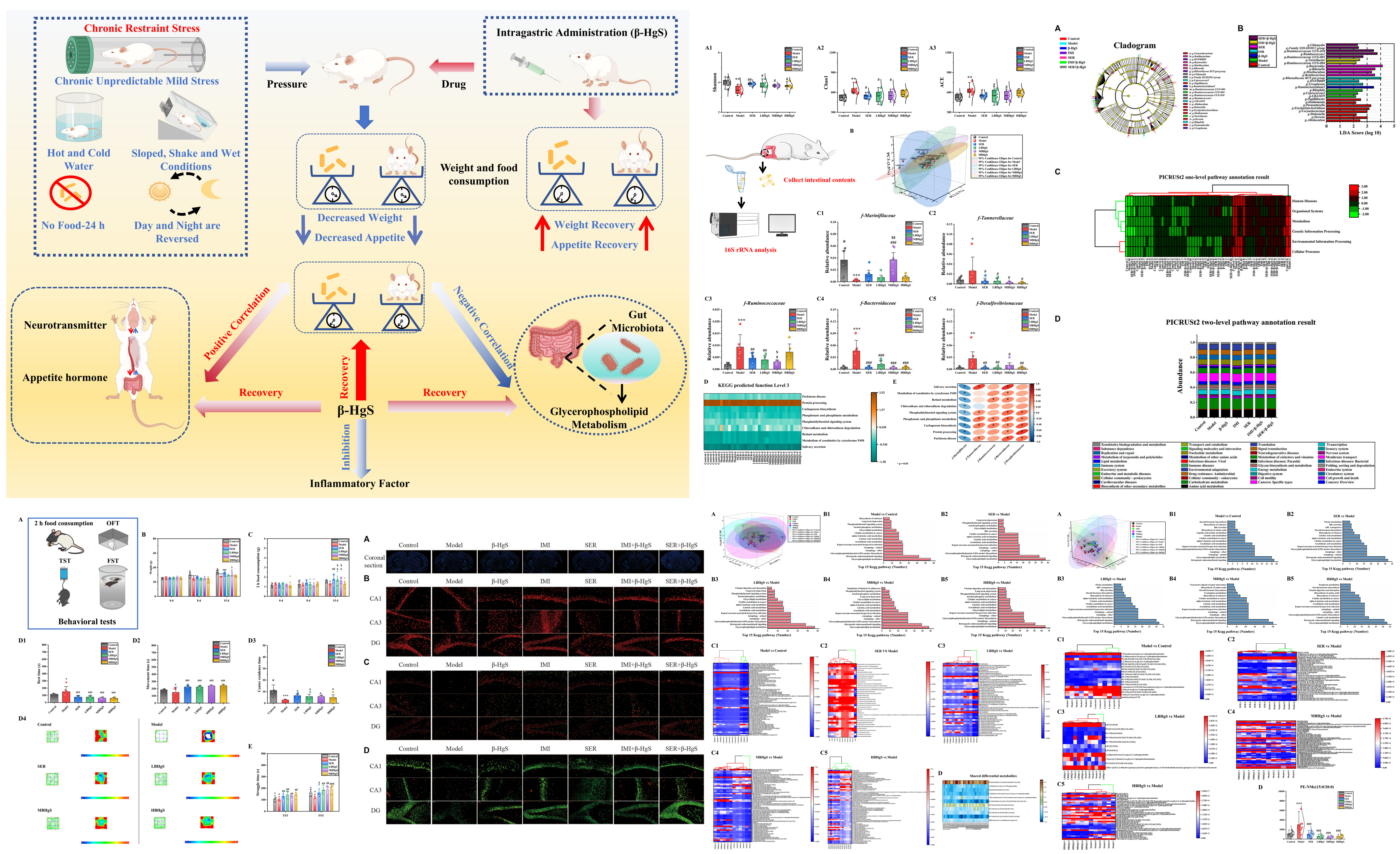 中國(guó)科學(xué)院西北高原生物研究所高原藏藥資源質(zhì)控與藥理毒理評(píng)價(jià)研究團(tuán)隊(duì)采用行為學(xué),病理學(xué),多組學(xué)等方法,探究β-HgS對(duì)抑郁小鼠的調(diào)控途徑。研究結(jié)果表明,β-HgS能夠恢復(fù)小鼠抑郁樣行為,改善食欲和體重,增強(qiáng)海馬神經(jīng)元增殖,調(diào)節(jié)腸道內(nèi)環(huán)境,并且β-HgS通過(guò)腦-腸軸影響甘油磷脂代謝改善應(yīng)激小鼠抑郁樣癥狀。此外,β-HgS能夠增強(qiáng)一線抗抑郁藥物(舍曲林)和經(jīng)典抗抑郁藥物(丙咪嗪)的療效。該研究β-HgS為及其母藥佐太在抗抑郁藥品研發(fā)中提供科學(xué)依據(jù)。