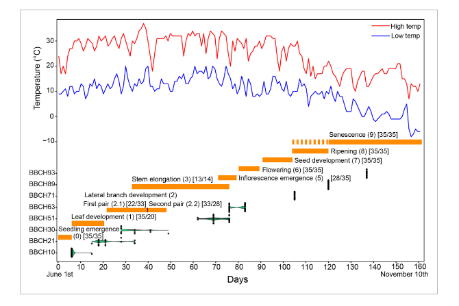 生長發(fā)育階段及其標志性發(fā)育事件的確認是開展遺傳學研究、建立表型變異和遺傳控制基因之間因果關系的重要前提條件?;趪HBBCH編碼系統(tǒng),課題組定義了9個沙蓬生長發(fā)育階段,涵蓋了整個生活史,明確了標志性發(fā)育事件,建立了沙蓬BBCH編碼系統(tǒng)。通過大田實驗,驗證了該編碼系統(tǒng)的可行性,量化了各個主要階段及其次級細分階段的時間持續(xù)范圍,為開展沙蓬種質(zhì)資源評價、分子遺傳學研究和遺傳馴化建立了生長發(fā)育時期轉(zhuǎn)換的表型參考標準。