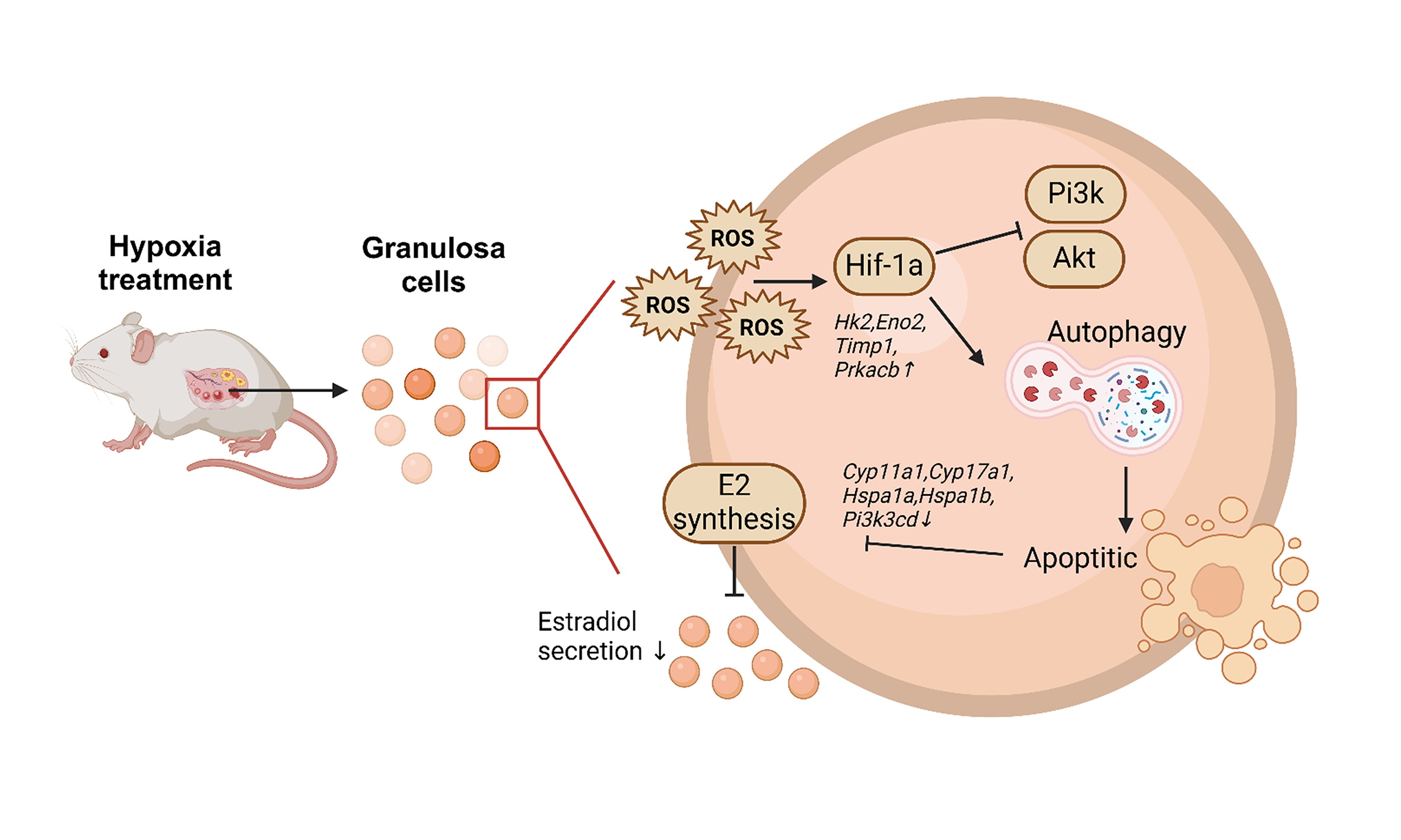 文章模式圖:胚胎期低氧誘導(dǎo)成年卵巢顆粒細(xì)胞的Hif1a激活和自噬