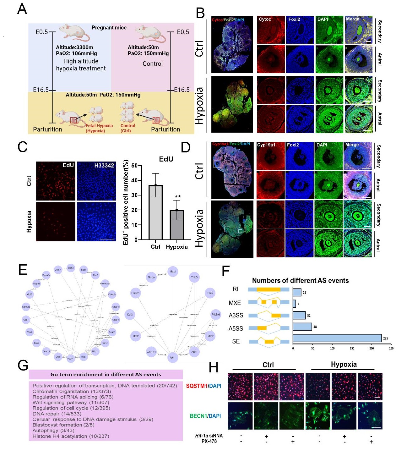 文章代表圖:A:胚胎期低氧模型建立示意圖;B:細(xì)胞色素C免疫熒光染色;C:體外細(xì)胞培養(yǎng)EdU細(xì)胞增殖活性檢測(cè);D:雌激素合成轉(zhuǎn)化關(guān)鍵酶Cyp19a1免疫熒光染色;E:轉(zhuǎn)錄因子PPI富集分析圖;F:不同類(lèi)型可變剪切差異統(tǒng)計(jì);G:不同可變剪切事件發(fā)生基因的Go富集分析;H:體外實(shí)驗(yàn)通過(guò)轉(zhuǎn)染Hif-1a SiRNA 和抑制劑添加檢測(cè)自噬相關(guān)蛋白表達(dá)水平