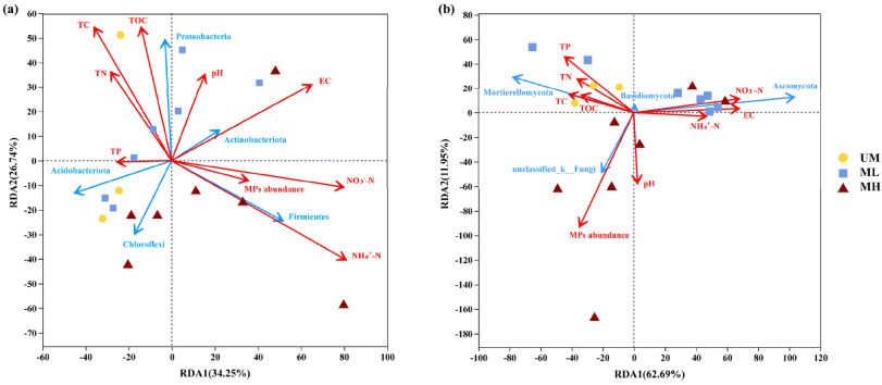 高通量測序分析表明,塑料圈中的α多樣性(Chao1和香農(nóng)指數(shù))低于土壤中的α多樣性,且隨土壤中微塑料豐度的變化而顯著不同。隨著微塑料豐度的增加,土壤中有機(jī)質(zhì)降解類群和光自養(yǎng)類群的比例也隨之增加,并顯示在塑料圈中富集。功能預(yù)測進(jìn)一步表明,微塑料的豐度影響了土壤的潛在功能,如與碳和氮循環(huán)相關(guān)的代謝途徑。與土壤環(huán)境相比,塑料圈中與有機(jī)物降解相關(guān)的功能豐度較高,且塑料圈的潛在健康風(fēng)險(xiǎn)更高。根據(jù)冗余(RDA)分析,可以確定環(huán)境理化性質(zhì)和微塑料豐度對真菌群落的影響大于對細(xì)菌群落的影響(圖3)。這表明,微塑料豐度會影響微生物多樣性組成,并可能影響土壤生態(tài)系統(tǒng)的整體性能。