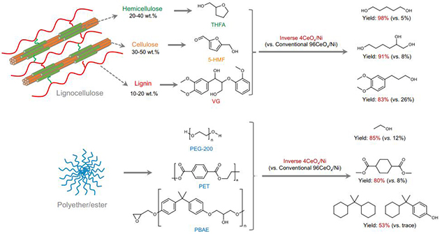 圖1. CeOx/Ni反相催化劑實(shí)現(xiàn)多種生物基化合物及廢棄塑料的高值化利用