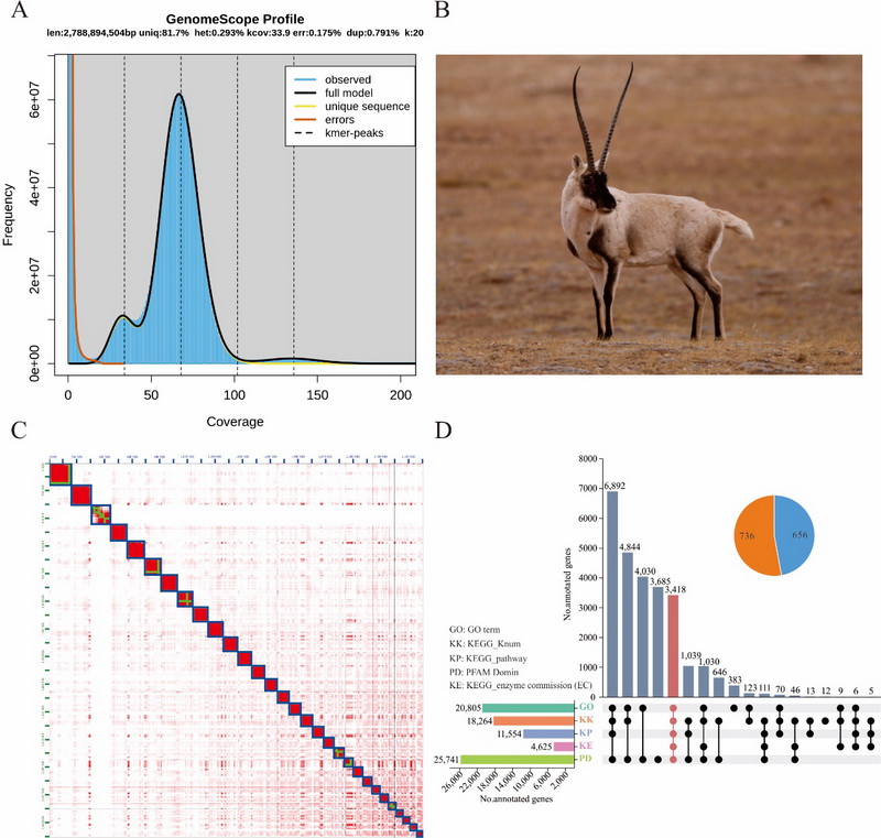 中國科學(xué)院西北高原生物研究所動物生態(tài)與資源保護(hù)研究團(tuán)隊聯(lián)合青海大學(xué),基于PacBio HiFi三代基因組測序、Hi-C測序和DNBSEQ-T7二代基因組survey測序三種測序技術(shù),成功組裝了藏羚染色體級別的基因組。結(jié)果顯示,藏羚基因組大小為3.1 Gb,Contig N50為84.6 Mb,所有基因掛載到30條染色體上(29?。),與之前的核型研究一致。數(shù)據(jù)評估顯示,藏羚基因組BUSCO得分為98.2%(S:92.3%,D:5.9%,F(xiàn):0.8%,M:1.0%),平均QV值為70.14,表明組裝的連續(xù)性好,完整度和準(zhǔn)確性高?;贓DTA和RepeatModeler從頭預(yù)測的藏羚基因組中重復(fù)序列注釋結(jié)果表明,藏羚基因組重復(fù)序列主要由SINEs、LINEs、LTRs 和DNA transposons四種類型組成,序列總長度為1.65 Gb,占基因組的52.47%;基于蛋白同源預(yù)測、蛋白從頭預(yù)測和深度學(xué)習(xí)等多種策略,在藏羚基因組上共注釋到28,330個功能基因。綜上,通過多種技術(shù)手段,首次獲得了藏羚染色體水平的高質(zhì)量基因組和注釋信息,為藏羚的適應(yīng)進(jìn)化遺傳機(jī)制、保護(hù)遺傳學(xué)研究及進(jìn)一步探索物種遷徙行為的遺傳機(jī)制提供了重要的基因組資源。