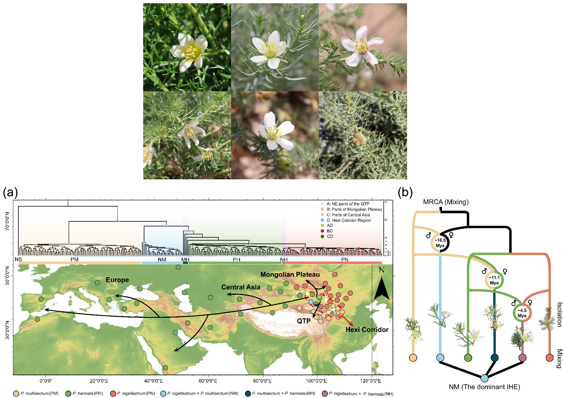 中國科學(xué)院西北高原生物研究所青藏高原植物適應(yīng)與進化研究團隊綜合利用Illumina二代測序、Oxford Nanopore三代測序及Hi-C互作圖譜技術(shù),成功構(gòu)建了多裂駱駝蓬的高質(zhì)量染色體水平參考基因組(2n=2x=24,基因組大小為314.37 Mb)?;谥衼喐珊祬^(qū)及其周邊地區(qū)的廣泛采樣,本研究對駱駝蓬屬及其中間形態(tài)類群的28個群體共284個個體進行了全基因組重測序。研究結(jié)果表明,駱駝蓬屬起源于河西走廊地區(qū),通過擴散作用和地理隔離形成了多裂駱駝蓬、駱駝蒿和駱駝蓬的異域物種形成。隨后,這些物種再次擴散至河西走廊地區(qū),通過頻繁的基因交流演化出多種間斷雜交實體。本研究首次在中亞干旱區(qū)揭示了駱駝蓬屬的物種形成符合“混合-隔離-混合循環(huán)”(MIM cycles,Mixing-Isolation-Mixing cycles)的演化框架,解析了雜交物種形成的中間過渡階段。此外,研究發(fā)現(xiàn),間斷雜交實體通過基因交流繼承了親本的優(yōu)良性狀(如DNA損傷修復(fù)能力和抗旱適應(yīng)性),從而在自然選擇中表現(xiàn)出顯著的優(yōu)勢。通過對不同物種的轉(zhuǎn)錄組測序分析,進一步驗證了間斷雜交實體中與適應(yīng)性進化相關(guān)的基因存在顯著差異表達。本研究通過對中亞干旱區(qū)駱駝蓬屬的系統(tǒng)性群體遺傳學(xué)研究,揭示了其獨特的物種形成模式,為雜交物種形成中間階段的研究提供了重要的模式類群,并為物種與雜交種間的適應(yīng)性進化機制提供了新的理論依據(jù)。