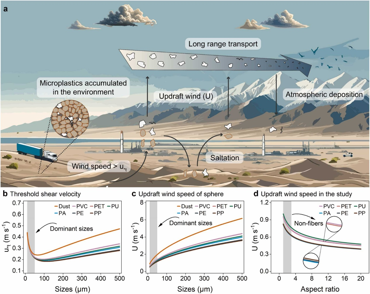 研究團(tuán)隊通過對祁連山地區(qū)的總懸浮顆粒物進(jìn)行系統(tǒng)采樣,探究了該地區(qū)的大氣微塑料污染,并使用拉格朗日粒子擴(kuò)散模型探索了大氣微塑料的潛在源區(qū)。結(jié)果顯示,大氣微塑料數(shù)量濃度為4.07±2.37 個 m-3,在春季最高;大氣微塑料質(zhì)量濃度為0.126±0.152 μg m-3,在冬季最大。微塑料主要聚合物類型為PA、PE、PET、PP、PU和PVC,微塑料數(shù)量集中在小于50微米的尺寸,形狀以碎片為主。局地人類活動對大氣中微塑料濃度的影響有限,潛在源區(qū)的粉塵排放顯著影響大氣微塑料濃度。粉塵和微塑料的相似閾值剪切速度表明它們在潛在源區(qū)的沙塵事件期間共同排放。一旦微塑料被夾帶到氣流中,微塑料懸浮所需較低的上升風(fēng)速會促進(jìn)微塑料長距離大氣傳輸。