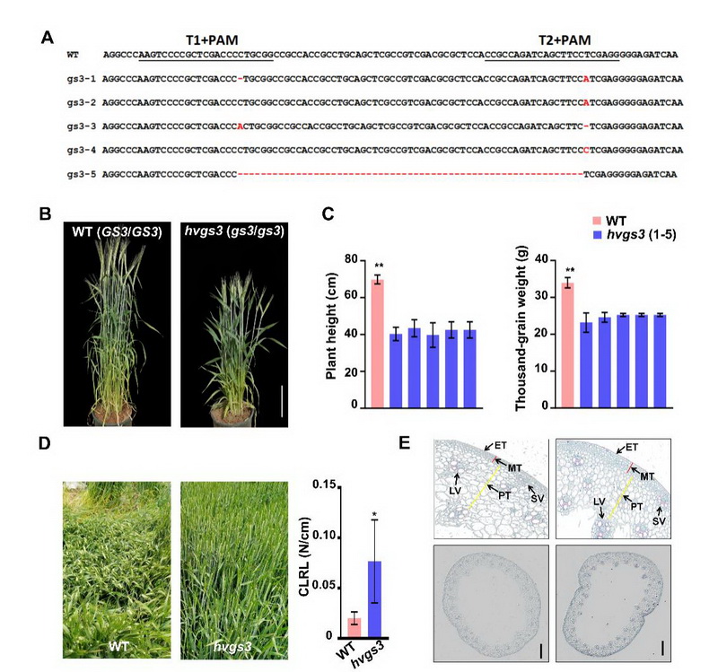 Gγ亞基在多種生物過程中發(fā)揮著重要作用,但其在大麥中的具體功能尚未完全明確。為了深入研究這一問題,中國科學(xué)院西北高原生物研究所高原作物種質(zhì)資源創(chuàng)新與利用研究團(tuán)隊(duì)利用CRISPR/Cas9技術(shù)敲除大麥品種Golden Promise中的HvGS3基因,并通過詳細(xì)的表型分析比較了突變體hvgs3與野生型之間的株高、穗長和千粒重等農(nóng)藝性狀。結(jié)果顯示,突變體hvgs3的株高比野生型降低了37.8%至43.1%,同時(shí)倒二節(jié)的抗倒伏指數(shù)提高了76.6%。進(jìn)一步分析發(fā)現(xiàn),突變體hvgs3的莖節(jié)細(xì)胞長度顯著縮短,導(dǎo)致株高降低。突變體hvgs3的木質(zhì)素合成通路被激活,木質(zhì)素含量比野生型增加了22%,基部第二節(jié)間的維管束數(shù)量、機(jī)械組織厚度均高于野生型,從而增強(qiáng)了莖稈的機(jī)械強(qiáng)度。通過CRISPR/Cas9技術(shù)成功敲除HvGS3基因,我們創(chuàng)制了一種具有矮化和抗倒伏特性的大麥新種質(zhì)資源,株高的降低和莖稈強(qiáng)度的增加共同提升了其抗倒伏性能。該研究不僅揭示了大麥HvGS3基因的功能,還為培育抗倒伏、高產(chǎn)的大麥品種提供了寶貴的理論依據(jù)和技術(shù)支持。