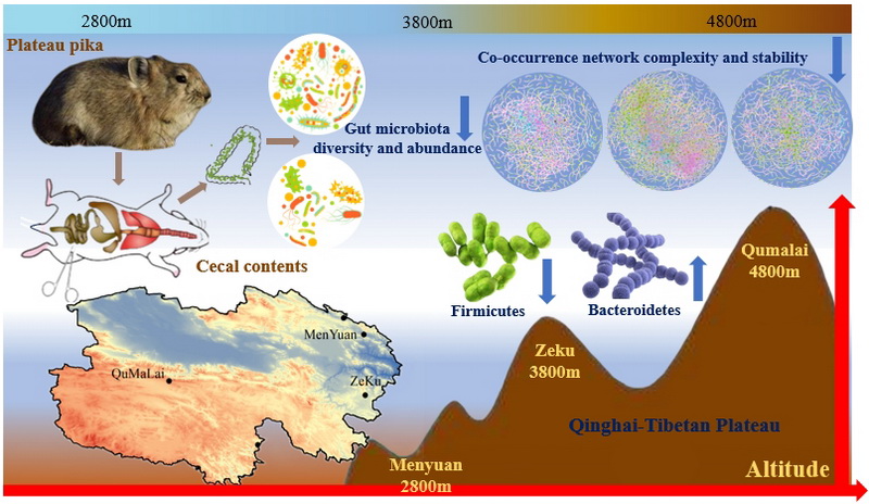 中國科學院西北高原生物研究所動物生態(tài)與資源保護研究團隊以青藏高原為研究區(qū)域,系統探討了高原鼠兔(Ochotona curzoniae)在不同海拔梯度下的腸道菌群結構及功能變化。通過16S rRNA基因測序及短鏈脂肪酸(SCFA)含量分析,評估了不同海拔環(huán)境下腸道菌群的組成、功能及代謝特征。研究結果表明,隨著海拔升高,腸道菌群的α多樣性顯著下降,微生物群共現網絡的復雜性亦呈減少趨勢。然而,SCFA的含量在不同海拔間未表現出顯著差異,表明高原鼠兔對SCFA的產生和需求可能已趨于穩(wěn)定。此外,微生物群落結構隨海拔變化呈現適應性調整的趨勢,具體表現為擬桿菌門相對豐度的顯著上升,而厚壁菌門的比例則顯著下降。進一步分析微生物群落的組裝機制發(fā)現,隨海拔升高,群落組裝過程逐漸趨于確定性,表明環(huán)境篩選在高海拔條件下對微生物群落的塑造作用增強。KEGG通路分析揭示,高原鼠兔腸道菌群在代謝、遺傳信息處理及有機體系統相關通路上呈現顯著上調趨勢。高原鼠兔腸道菌群可能通過調控代謝途徑及富集適應高原環(huán)境的微生物種群,以幫助宿主應對極端的高海拔生態(tài)壓力。本研究強調了腸道菌群在動物適應極端環(huán)境中的關鍵作用,揭示了海拔對腸道菌群組成與功能的影響,為理解動物如何通過微生物機制適應高海拔環(huán)境提供了科學依據。研究成果不僅對高原鼠兔的生態(tài)適應研究具有重要意義,也為其他極端環(huán)境物種的研究提供了參考。