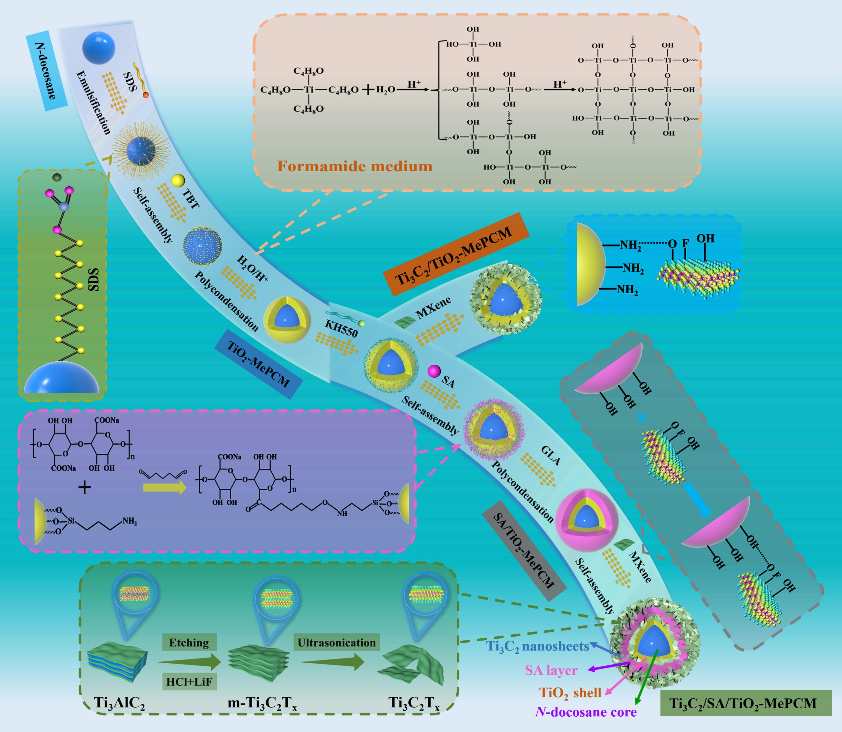 1. Ti3C2Tx修飾相變微膠囊的合成策略及反應(yīng)機(jī)理示意圖