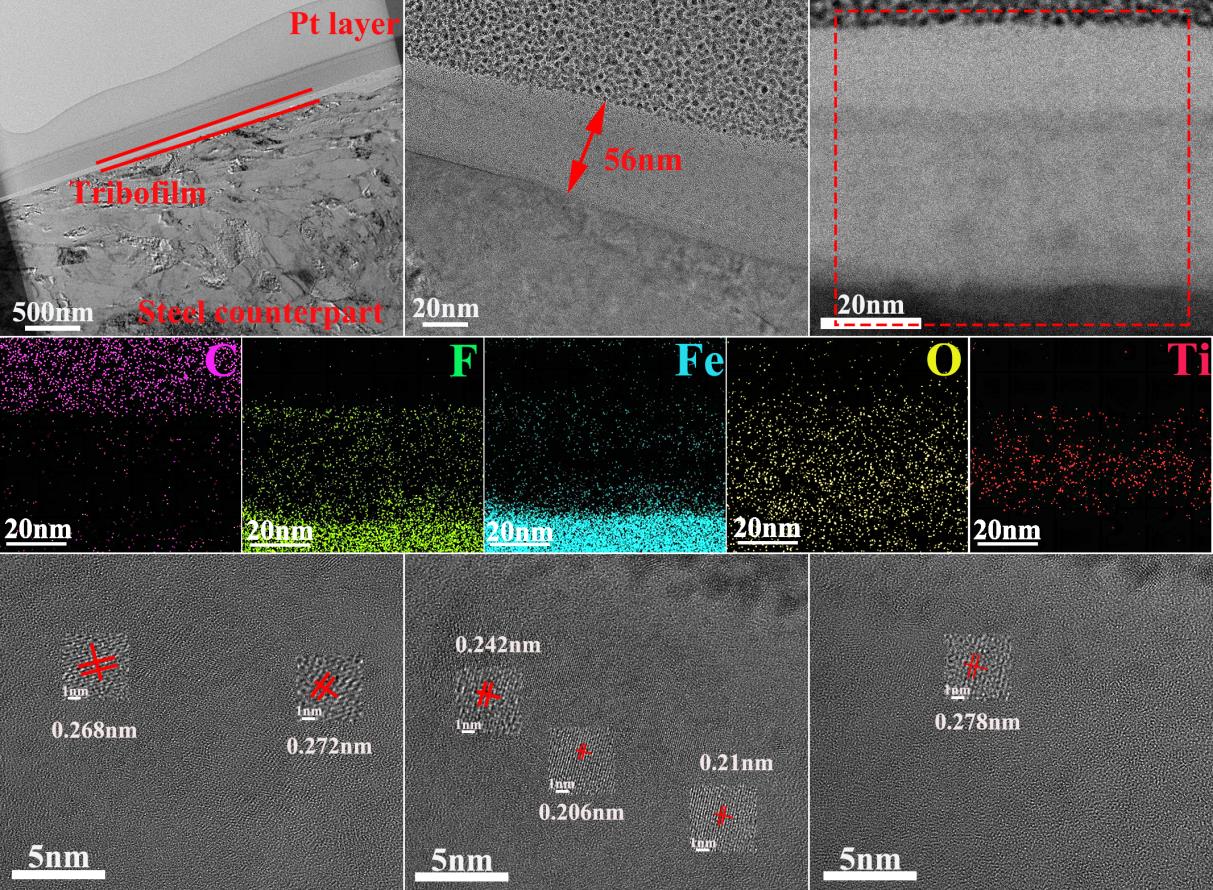 近期,針對(duì)纖維織物自潤滑復(fù)合材料摩擦學(xué)性能協(xié)同優(yōu)化的技術(shù)難題,研究團(tuán)隊(duì)基于前期研究基礎(chǔ),制備了具有核殼結(jié)構(gòu)的Ti3C2/SA/TiO2-MePCM相變微膠囊。該微膠囊以機(jī)械強(qiáng)度優(yōu)異的二氧化鈦為殼層增強(qiáng)復(fù)合材料力學(xué)性能,內(nèi)核正二十二烷通過相變作用吸收摩擦熱并實(shí)現(xiàn)局部固-液協(xié)同潤滑,同時(shí)二維材料Ti3C2Tx憑借其層間滑移特性和高承載能力有效降低復(fù)合材料的摩擦損傷。實(shí)驗(yàn)數(shù)據(jù)表明,引入該微膠囊后纖維織物自潤滑復(fù)合材料的摩擦系數(shù)由0.053降至0.046,磨損率由8.9×10-14m3 (N·m)-1顯著降低至3.5×10-14m3(N·m)-1。研究團(tuán)隊(duì)通過多種表征技術(shù)系統(tǒng)解析了摩擦膜的微觀形貌演變規(guī)律,闡明了織物復(fù)合材料的減摩抗磨作用機(jī)制,為核殼結(jié)構(gòu)材料在摩擦學(xué)領(lǐng)域的創(chuàng)新應(yīng)用提供了理論支撐。