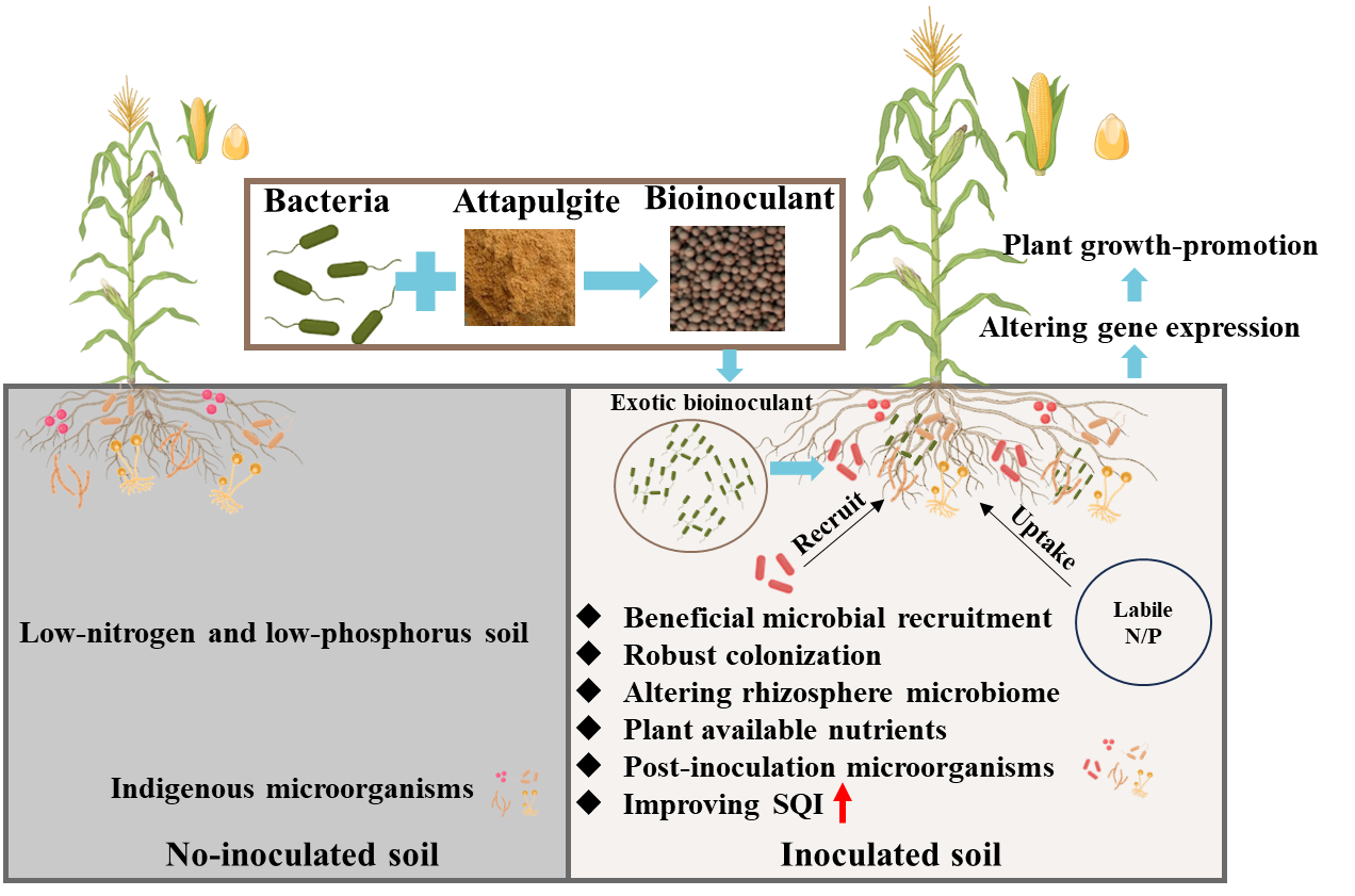 中國(guó)科學(xué)院西北生態(tài)環(huán)境資源研究院王若愚研究員團(tuán)隊(duì)與奧地利國(guó)家技術(shù)研究院的Angela Sessitsch教授和Günter Brader教授合作,系統(tǒng)揭示了固體顆粒微生物菌劑(貝萊斯芽孢桿菌Bacillus velezensis FZB42與粘土材料組成)通過(guò)調(diào)控根際微生物群落和玉米基因應(yīng)答,改善貧瘠堿性黃土質(zhì)量并促進(jìn)玉米生長(zhǎng)的機(jī)制。研究設(shè)置了減施氮肥與不施磷肥的處理?xiàng)l件,探索了微生物菌劑在低外源肥料施用下,如何提高作物對(duì)土壤養(yǎng)分的吸收,進(jìn)而促進(jìn)增產(chǎn)的效果。