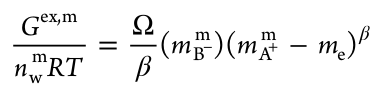研究人員受Pierre-Gilles de Gennes聚合物標(biāo)度理論[5]進(jìn)一步啟發(fā),提出“標(biāo)度正規(guī)溶液理論”(即,膜相中“有效自由反離子濃度”與“表觀自由反離子濃度”間的冪律關(guān)系),用以描述溶脹離子交換膜內(nèi)自由離子相互作用的超額吉布斯(Gex,m)自由能(式3):