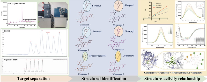 中國(guó)科學(xué)院西北高原生物研究所高原藏藥資源質(zhì)控與藥理毒理評(píng)價(jià)研究團(tuán)隊(duì)通過(guò)建立UPLC-QTOF-MS/MS結(jié)合高速逆流色譜和制備液相色譜的靶向分離技術(shù),成功從青稞苗中分離得到6個(gè)以大麥黃苷和皂草黃苷為母核的不同?;揎椀难苌?。通過(guò)多維度的分子相互作用研究發(fā)現(xiàn),大麥黃苷和皂草黃苷?;?,其α-葡萄糖苷酶抑制活性均明顯提高,表現(xiàn)為香豆?;?gt;阿魏?;?gt;對(duì)羥基苯甲?;?gt;芥子酰基。6個(gè)酰化黃酮與α-葡萄糖苷酶均具有較高的結(jié)合常數(shù),主要通過(guò)范德華力和氫鍵作用占據(jù)α-葡萄糖苷酶的活性位點(diǎn)并形成穩(wěn)定的復(fù)合物,并改變關(guān)鍵氨基酸殘基和二級(jí)結(jié)構(gòu),從而降低酶催化活性。該研究為復(fù)雜天然產(chǎn)物的靶向分離純化以及?;S酮與α-葡萄糖苷酶抑制活性之間的構(gòu)效關(guān)系的研究提供了新的思路。