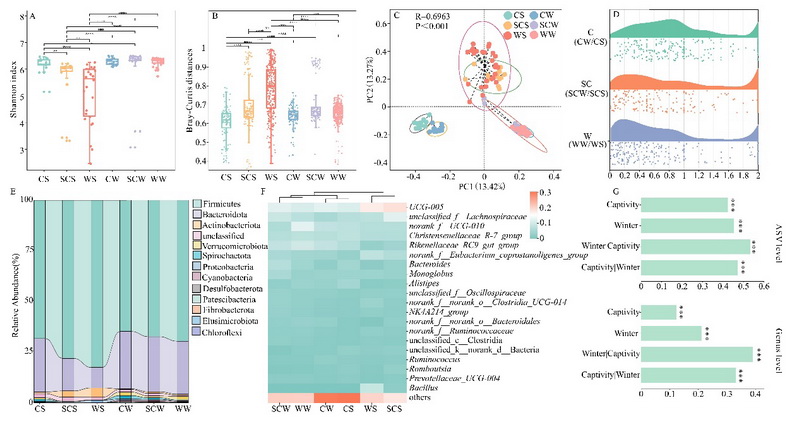 目前,腸道微生物群如何響應極端環(huán)境變化的機制仍不明確。白唇鹿(Przewalskium albirostris)是青藏高原特有的國家一級重點保護動物,是研究動物微生物群對季節(jié)變化和人類干擾適應機制的理想模型。中國科學院西北高原生物研究所動物生態(tài)與資源保護研究團隊,通過整合 16S rRNA 測序、宏基因組學與非靶向代謝組學等多組學方法,系統(tǒng)解析了白唇鹿在冬季和圈養(yǎng)環(huán)境下的腸道微生物組成、功能潛力及代謝特征。該研究不僅為理解高原特有動物腸道微生態(tài)系統(tǒng)的動態(tài)變化與適應策略提供了重要科學依據(jù),也從微生物學視角為瀕危物種的保護與管理提供了理論支持。