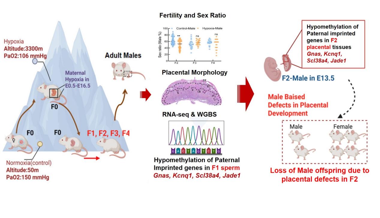 為探究母體低氧環(huán)境暴露對子代的跨代影響,中國科學院西北高原生物研究所動物生態(tài)與資源保護研究團隊建立了孕期低氧暴露小鼠模型,將經歷過孕期低氧暴露的小鼠(F0)轉運至低海拔后,出生的雄性小鼠和對照雌鼠合籠,連續(xù)飼養(yǎng)四代(F1-F4)。從2018年 9月到 2023年 8月,通過大量出生性別統(tǒng)計和不同發(fā)育階段的性別鑒定,發(fā)現母體孕期低氧暴露會造成F2代雄性個體顯著減少。進一步的分析發(fā)現F2雄性減少是由于在胚胎期13.5天發(fā)生的胚胎特異性丟失。雄性胚胎丟失的主要原因為胎盤形態(tài)和功能異常。研究團隊通過胎盤轉錄組和全基因組DNA甲基化測序聯(lián)合分析,發(fā)現父源印記基因Slc38a4,Gnas,Jade1 和Kcnq1表達異常。隨后,通過對F1代小鼠成熟精子與F2代雄性胎盤全基因組DNA甲基化進行聯(lián)合分析,結果發(fā)現以上印記基因DNA甲基化模式高度相似。這說明經歷胚胎期低氧的F1代雄性小鼠的精子存在甲基化異常,并且可以進一步影響F2雄性個體生長發(fā)育進而導致性別比例異常。該工作系統(tǒng)地揭示母體低氧暴露對F1及F2代發(fā)育影響的跨代遺傳機制,為深入理解高原低氧暴露的生殖和健康風險提供了新的表型數據。