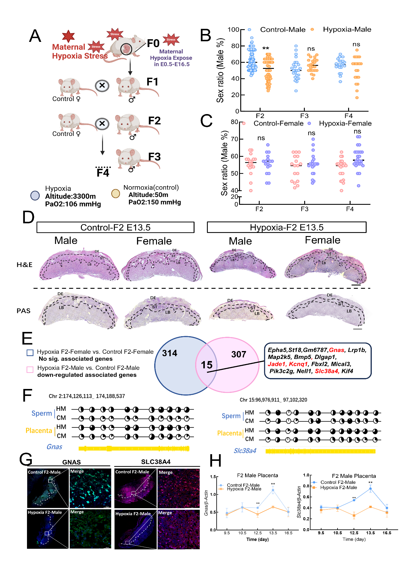 文章代表圖片A:低氧暴露及傳代實驗模式圖;B:F2-F4代雄性組胚胎出生性別比例統(tǒng)計;C:F2-F4代雌性組胚胎出生性別比例統(tǒng)計;D:H&E染色分析F2代E13.5不同性別小鼠胎盤形態(tài);EWGBS與轉錄組聯(lián)合分析篩選差異父源印記基因;F候選基因在F1精子和F2胎盤中甲基化位點的甲基化水平;G候選基因在E13.5胎盤中的蛋白表達免疫熒光染色;H候選基因在F9.5-E16.5胎盤中的基因表達變化趨勢。