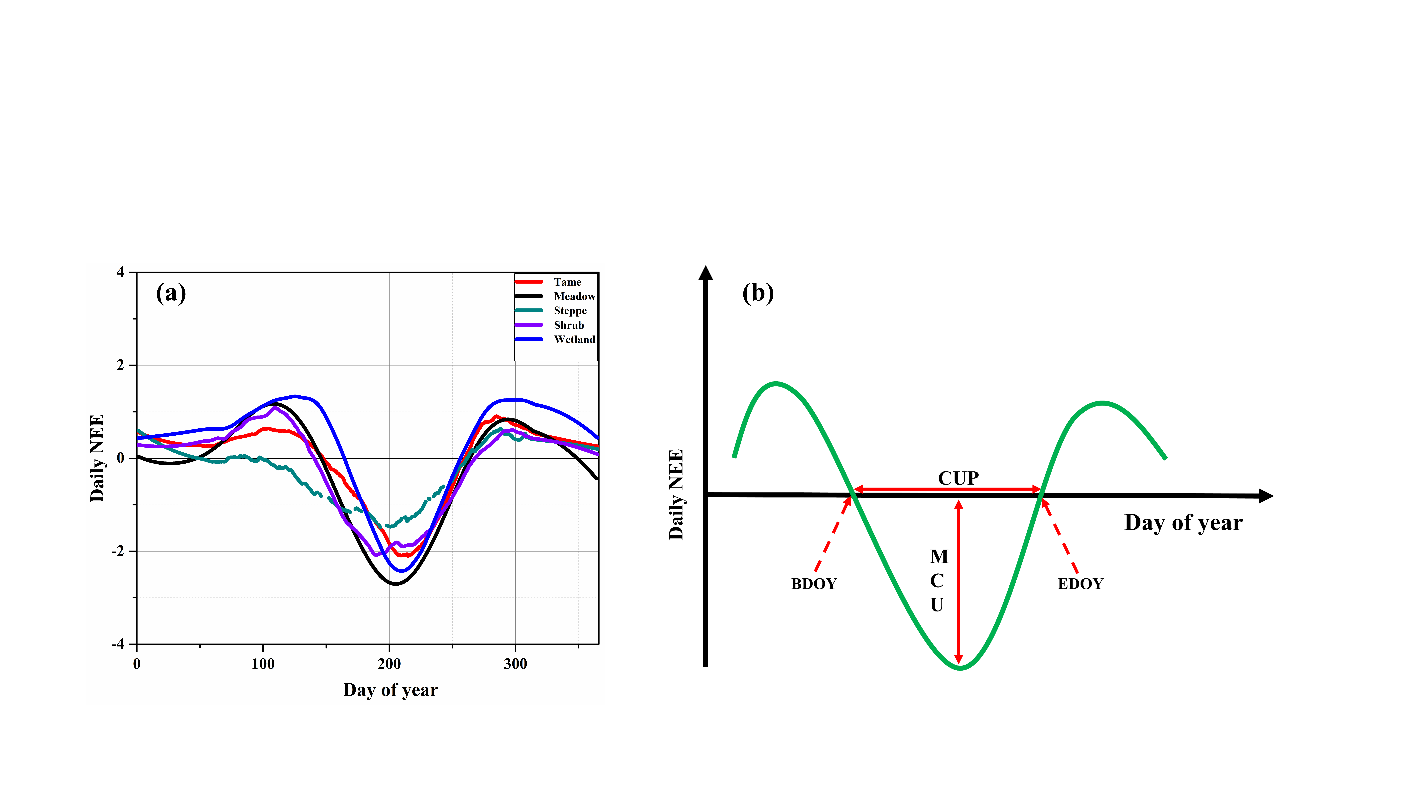 針對(duì)這一科學(xué)問(wèn)題,中國(guó)科學(xué)院西北高原生物研究所青海三江源草地生態(tài)系統(tǒng)國(guó)家野外科學(xué)觀測(cè)研究站依托 10 余年原位觀測(cè),整合11個(gè)高寒草甸、7個(gè)高寒濕地、2個(gè)高寒灌叢草甸和 3 個(gè)高寒草原共24個(gè)站點(diǎn)的84年觀測(cè)數(shù)據(jù),將年NEE分解為物候?qū)W組分(碳吸收期,CUP)和生理學(xué)組分(最大凈碳吸收速率,MCU),系統(tǒng)解析了CUP與 MCU對(duì)NEE 的調(diào)控機(jī)制及主導(dǎo)環(huán)境因子。