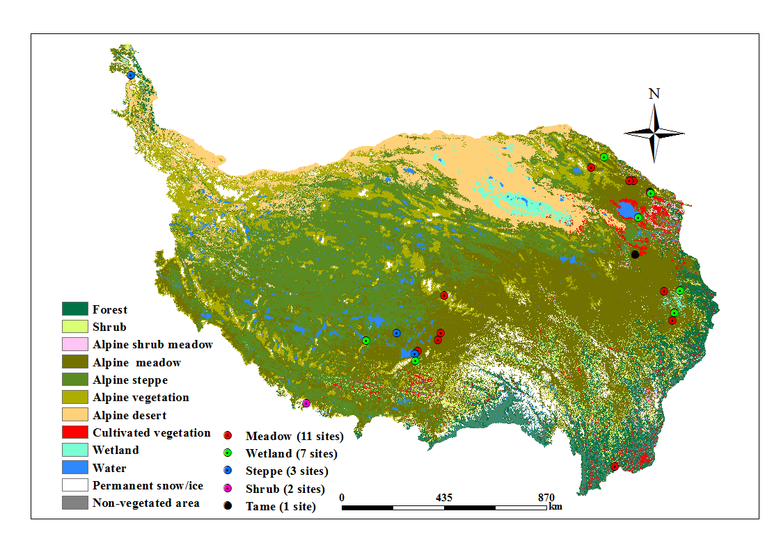 圖2青藏高原 24 個(gè)渦度相關(guān)觀測(cè)站點(diǎn)的位置