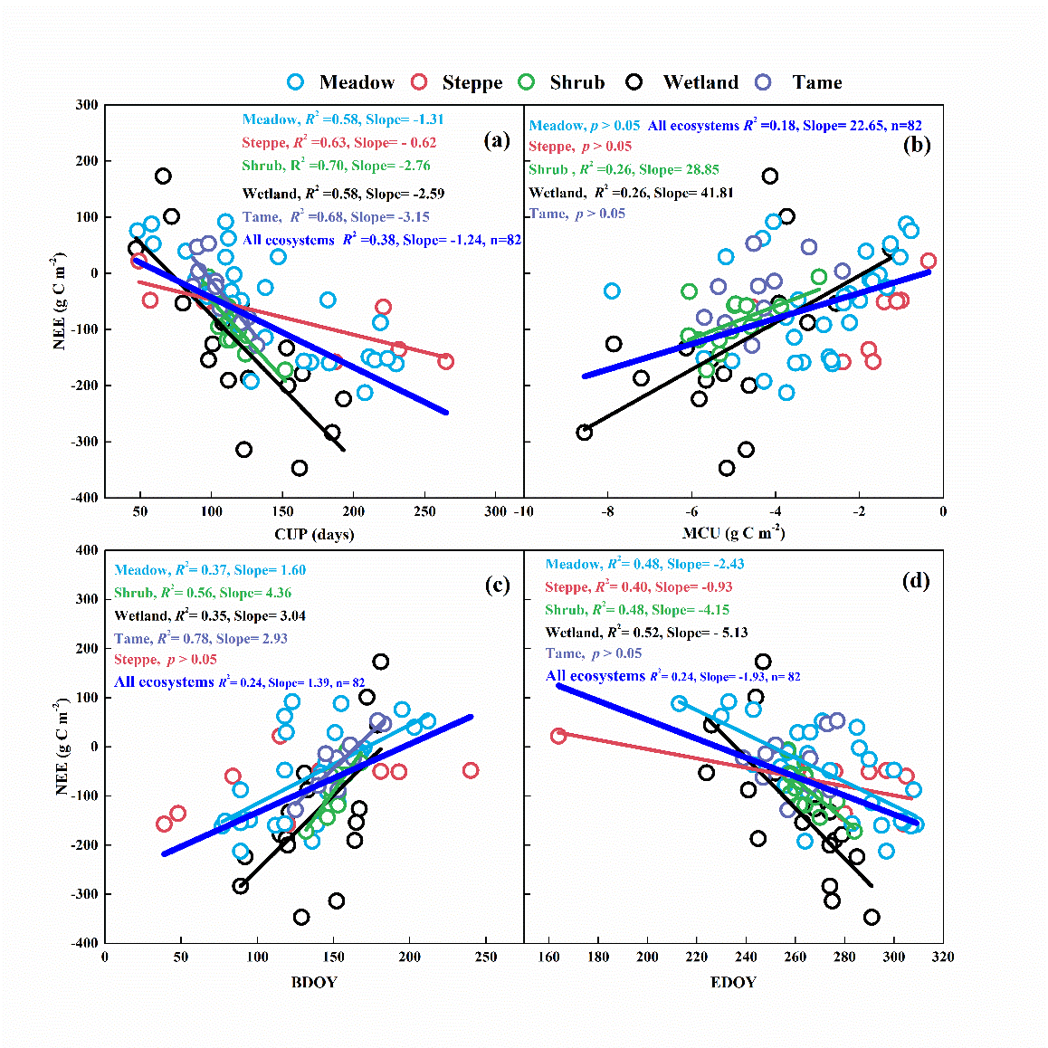 圖 3 (a) 高寒草甸、灌叢、濕地、草原及人工草地中年凈生態(tài)系統(tǒng)碳交換(NEE)隨凈碳吸收期(CUP)的變化;(b) 隨最大凈碳吸收速率(MCU)的變化;(c) 隨凈碳吸收起始日(BDOY)的變化;(d) 隨凈碳吸收終止日(EDOY)的變化