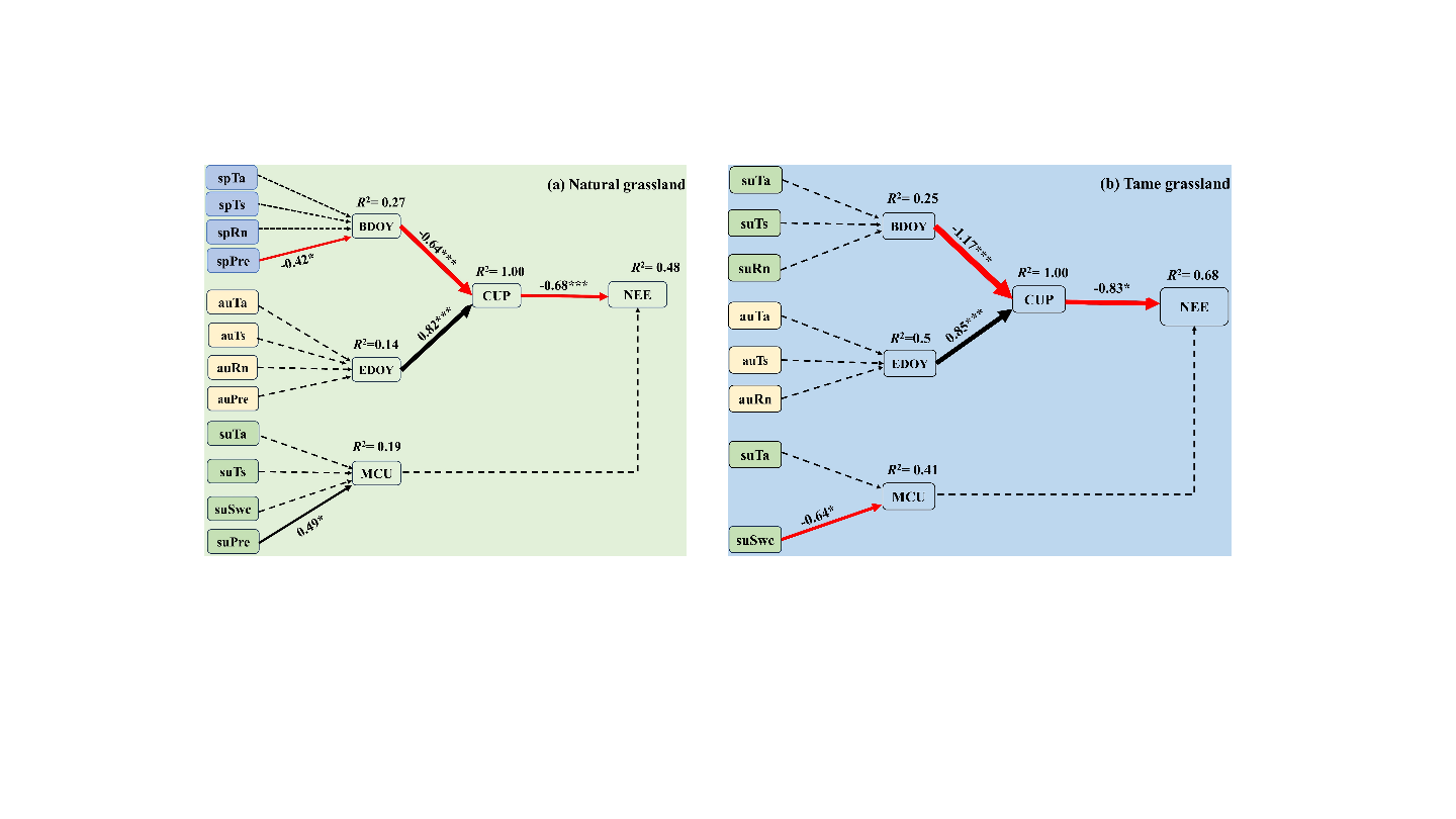 圖4 天然草地與人工草地中環(huán)境因子對(duì)凈生態(tài)系統(tǒng)碳交換(NEE)、凈碳吸收期(CUP)及最大凈碳吸收速率(MCU)影響的結(jié)構(gòu)方程模型分析