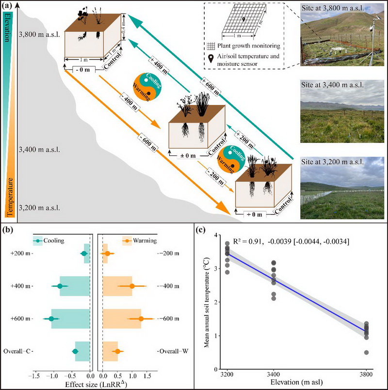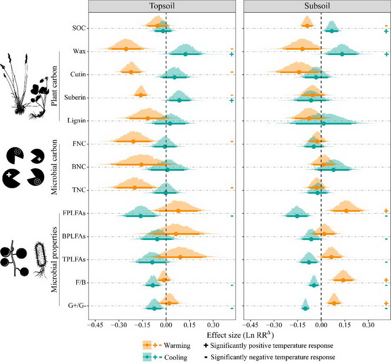 中國科學(xué)院西北高原生物研究所高寒生態(tài)系統(tǒng)與全球變化研究團(tuán)隊(duì)依托2007年在青海海北高寒草地生態(tài)系統(tǒng)國家野外科學(xué)觀測研究站建立的“山體垂直帶雙向移栽實(shí)驗(yàn)”平臺(tái),基于生物標(biāo)志物技術(shù),并借助貝葉斯Meta統(tǒng)計(jì)分析在估計(jì)研究間異質(zhì)性和合并效應(yīng)量方面的優(yōu)勢(尤其在納入研究數(shù)量較少時(shí))、獨(dú)特的后驗(yàn)分布估計(jì)、靈活的參數(shù)設(shè)置和便利的結(jié)果圖形化展示方法等特點(diǎn),創(chuàng)新性地采用貝葉斯Meta分析方法分析控制實(shí)驗(yàn)數(shù)據(jù),對多組處理、對照實(shí)驗(yàn)進(jìn)行了歸納性總結(jié),進(jìn)而系統(tǒng)評(píng)估量化了增溫、降溫16年后高寒草甸表層(0-10 cm)和亞表層土壤(20-30 cm)有機(jī)碳含量的影響因素(包括植物生物量和多樣性、土壤理化性質(zhì)、植物源碳組分,微生物源碳組分以及微生物群落特性等)的變化及其與有機(jī)碳含量的關(guān)系。