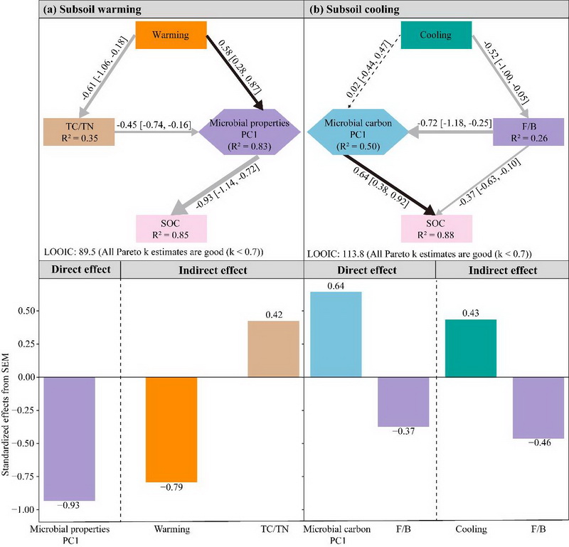 研究發(fā)現(xiàn),高寒草甸亞表層土壤有機(jī)碳對增溫、降溫的響應(yīng)較表層更為敏感,無論是增溫還是降溫,均未引起亞表層土壤中植物和微生物源碳組分的顯著變化。然而,增溫使真菌與細(xì)菌生物量比值(F/B)和革蘭氏陽性細(xì)菌與革蘭氏陰性細(xì)菌生物量比值(G+/G-)分別增加15.0%和8.6%,而降溫則使其分別降低4.5%和9.6%。進(jìn)一步分析發(fā)現(xiàn),增溫主要通過增加F/B和G+/G-直接減少土壤有機(jī)碳庫的積累,同時(shí)降低土壤碳氮比間接減少亞表層土壤有機(jī)碳含量,而降溫則主要通過降低F/B增加亞表層土壤有機(jī)碳含量。如果只考慮增溫而不考慮降溫的作用,傳統(tǒng)的增溫控制實(shí)驗(yàn)可能會(huì)低估氣候變暖對高寒草地亞表層土壤有機(jī)碳庫的消極作用。該研究為更好地解釋和預(yù)測未來氣候變化背景下高寒草地生態(tài)系統(tǒng)土壤碳庫的形成與變化提供了新的理論依據(jù)。
