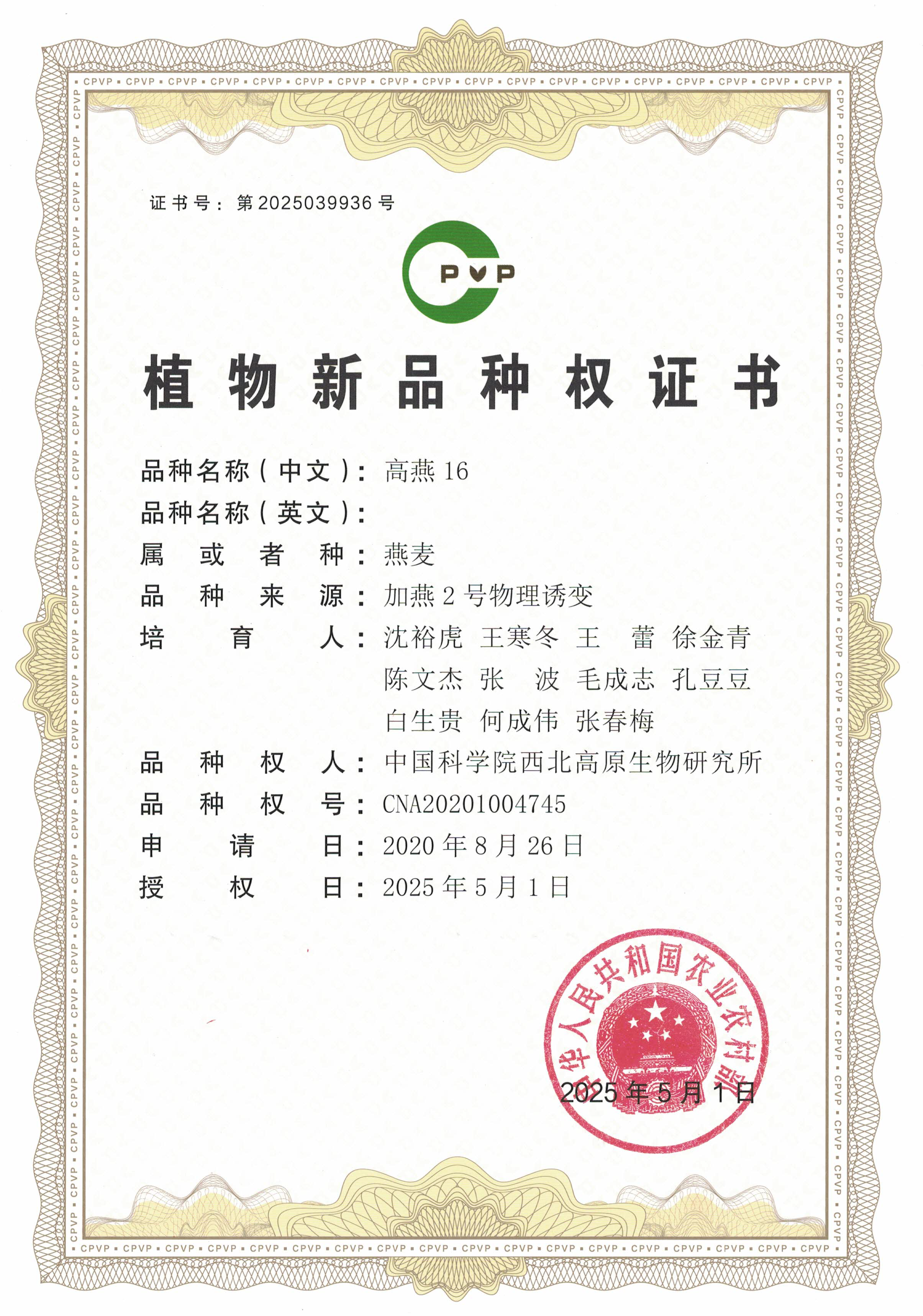 西北高原所燕麥品種高燕16獲得國(guó)家植物新品種保護(hù)權(quán)
