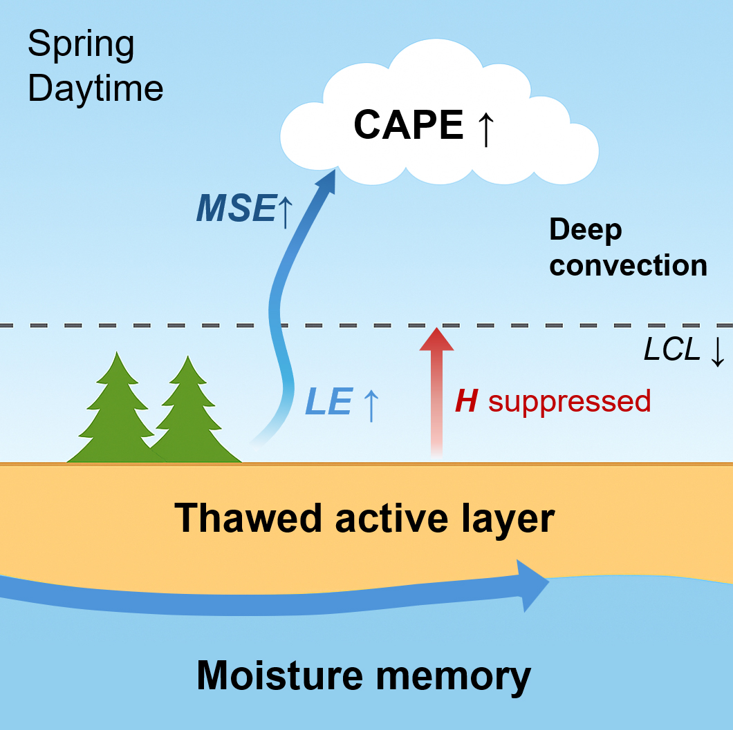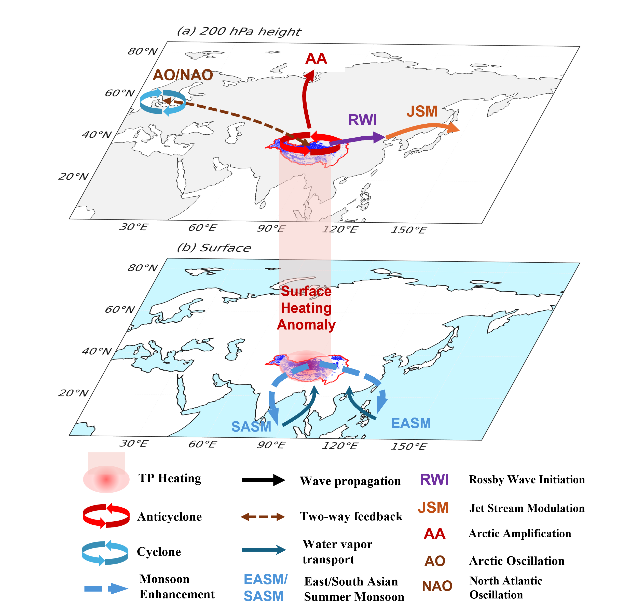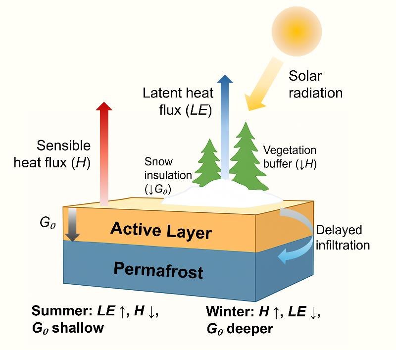 研究團(tuán)隊(duì)依托長期野外觀測(cè)、遙感反演和過程模擬,完整描繪了“地表能量分配→邊界層演變→季風(fēng)與行星波響應(yīng)”的多尺度反饋鏈條。結(jié)果表明,多年凍土的“凍融記憶”,即凍結(jié)或融化狀態(tài)在季節(jié)間延續(xù)并影響后續(xù)熱量與水分過程,并對(duì)土壤熱物理特性及潛熱/顯熱分配造成影響,共同決定了能量釋放的節(jié)奏與路徑,進(jìn)而影響邊界層穩(wěn)定性、對(duì)流觸發(fā)和大氣遙相關(guān)結(jié)構(gòu)。
