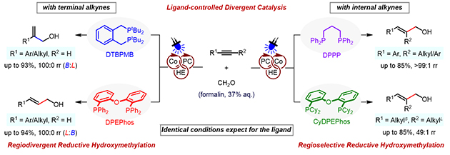 相關研究成果以“Regiodivergent Ligand-Controlled Cobalt-Catalyzed Reductive Hydroxymethylation of Alkynes with Aqueous Formaldehyde”為題發(fā)表在Angew. Chem. Int. Ed.上。博士生郭寧欣為論文第一作者,夏紀寶研究員為通訊作者。