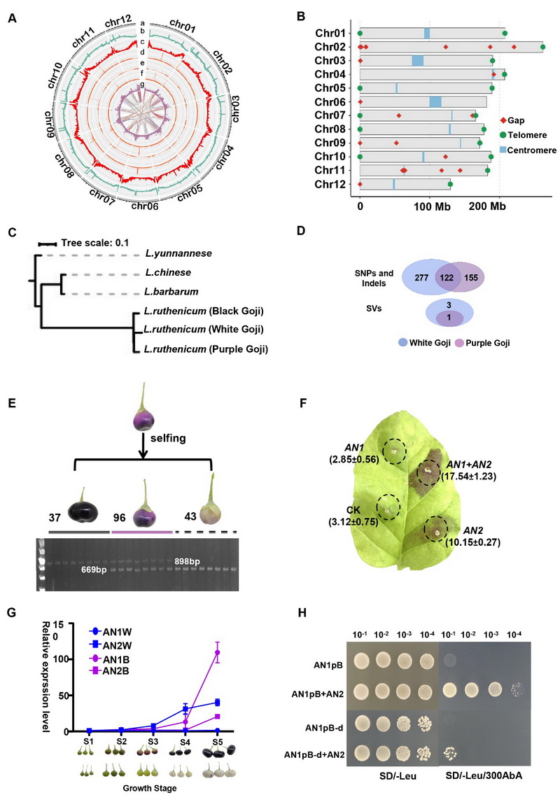 圖?黑果枸杞高質(zhì)量基因組及229 bp AN1 啟動子缺失導(dǎo)致果色分化。(A) 染色體基因組特征分布。(B) 缺口、端粒和著絲粒位置。(C) 枸杞屬系統(tǒng)發(fā)育樹。(D) 白、紫與黑果枸杞間花青素相關(guān)變異。(E) 紫果后代果色分離及基因型鑒定。(F) AN1/AN2 在煙草瞬時表達。(G) 白果與黑果 AN1/AN2 表達動態(tài)。(H) Y1H 驗證 AN2 與 AN1 啟動子的結(jié)合。