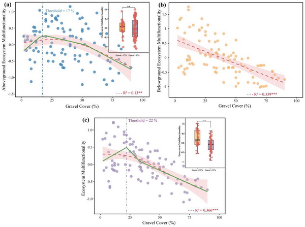 研究發(fā)現(xiàn),隨著礫石覆蓋度的增加,草地植物物種豐富度、功能群組成及生物量顯著下降,尤其是地下生物量的減少最為明顯;土壤含水量、孔隙度及養(yǎng)分含量顯著降低,而容重顯著升高,導致生態(tài)系統(tǒng)整體功能衰退。礫石化不僅直接抑制植物生長,還通過削弱土壤養(yǎng)分供給間接降低生態(tài)系統(tǒng)多功能性。隨機森林與結(jié)構(gòu)方程模型分析進一步揭示,土壤養(yǎng)分和植物多樣性是決定生態(tài)系統(tǒng)多功能性的關(guān)鍵調(diào)控因子。隨礫石化程度加劇,地上功能指數(shù)(AEMF)和地下功能指數(shù)(BEMF)均顯著下降,后者的響應更為敏感,當?shù)[石覆蓋度超過22%時,生態(tài)系統(tǒng)多功能性(EMF)出現(xiàn)明顯突變性下降,表明該閾值可作為高寒草地退化的早期預警指標。研究指出,高寒草地礫石化退化過程會破壞植物-土壤耦合關(guān)系,導致生態(tài)功能的同步退化。