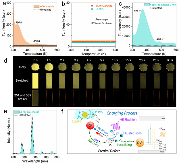 圖1.?SLMPD/PDMS在紫外輻照、X射線輻照和拉伸刺激前后的光譜對比,以及界面高能輻射缺陷物理機(jī)制。