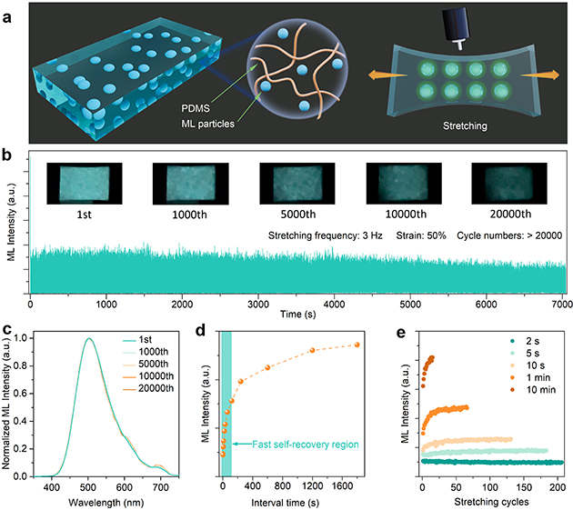 圖2. CaBa4(PO4)3Cl:Eu/PDMS復(fù)合彈性體的力致發(fā)光重復(fù)性和自恢復(fù)性。