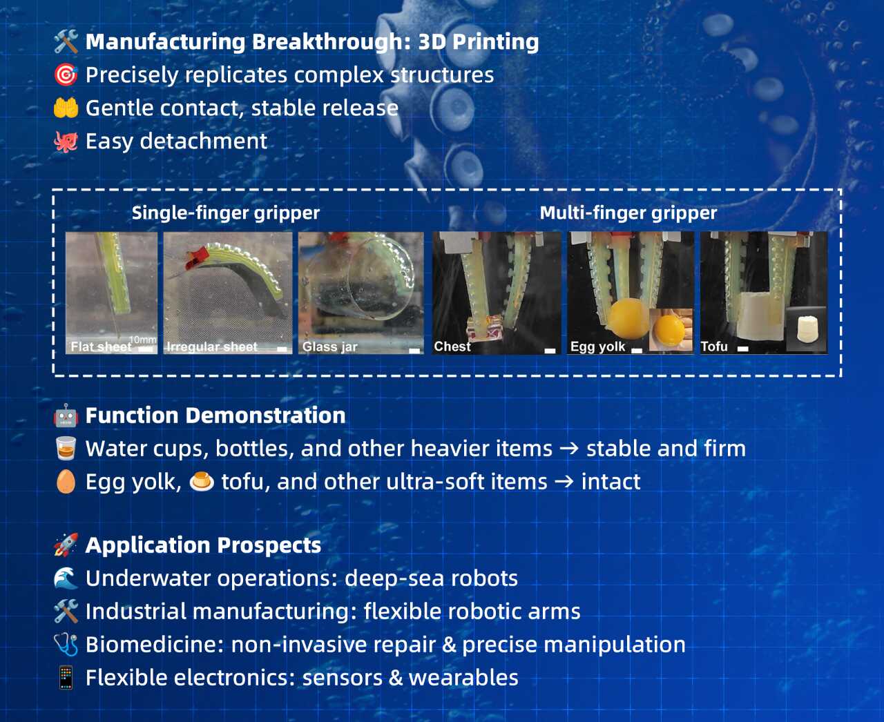 This bionic suction cup can be mounted on robotic arms to safely grasp ultra-soft objects like silken tofu or egg yolks. Its potential applications are wide-ranging: collecting fragile samples in deep-sea exploration,non-invasive attachment or surgical assistance in medical settings,and handling delicate parts in flexible manufacturing.