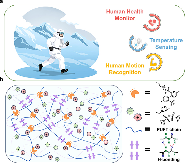 為探索聚氨酯材料的應(yīng)用潛力,基于上述研究,研究人員對聚氨酯材料內(nèi)部分子網(wǎng)絡(luò)設(shè)計和功能化進(jìn)行深入研究。為實現(xiàn)材料的導(dǎo)電性,引入更多具有額外極性的極性鍵是一種可能的策略,如碳-氟(C-F)鍵。由于F原子的高電負(fù)性,C-F鍵的強(qiáng)靜電性質(zhì)會增強(qiáng)進(jìn)入體系的電子極性,這樣陰離子和陽離子可彼此分布得更遠(yuǎn),在聚合物內(nèi)部移動更自由?;诖耍芯咳藛T提出了一種分子工程范式,利用氟的雙重功能在聚氨酯基質(zhì)中構(gòu)建空間相關(guān)但功能獨立的動態(tài)網(wǎng)絡(luò)。通過引入含氟擴(kuò)鏈劑和多氫鍵單元,構(gòu)建了氟-陽離子相互作用與高密度氫鍵協(xié)同的動態(tài)網(wǎng)絡(luò),氟的高電負(fù)性不僅與封端劑形成離子鍵增強(qiáng)網(wǎng)絡(luò)穩(wěn)定性,還通過偶極相互作用固定陽離子,構(gòu)建陰離子傳輸通道,保障離子高效遷移。從而成功制備了一種具備超敏感多參數(shù)監(jiān)測功能,可用于極地可穿戴設(shè)備形狀記憶聚氨酯材料。