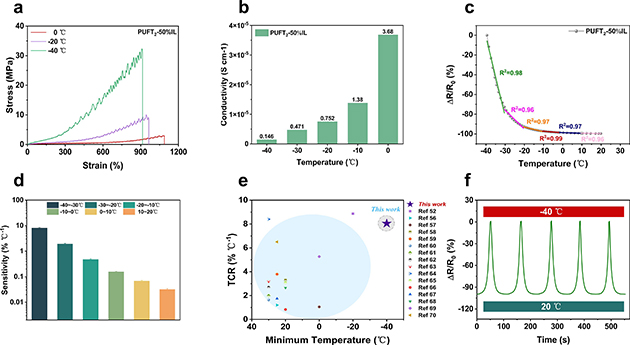 針對極地等極端環(huán)境的挑戰(zhàn),團(tuán)隊重點測試了材料的低溫耐受性。在-40℃時,材料仍能保持較高的強(qiáng)度、韌性、可拉伸性和離子電導(dǎo)率。此外,該材料表現(xiàn)出負(fù)溫度系數(shù)行為,在-40℃至-30℃超低溫區(qū)間的溫度系數(shù)電阻高達(dá)8.05% ℃-1,且在連續(xù)熱循環(huán)測試中表現(xiàn)出良好的穩(wěn)定性和可重復(fù)性,彰顯了其在深冷環(huán)境下可靠應(yīng)用的潛力。