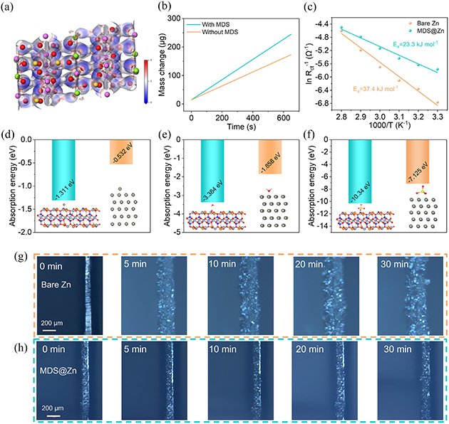 圖3. (a) MDS的靜電勢(shì)(ESP)分布圖。(b) 電化學(xué)石英晶體微天平(EQCM)測(cè)試中,有無(wú)MDS層時(shí)電鍍過(guò)程的質(zhì)量變化圖。(c) 基于電荷轉(zhuǎn)移電阻計(jì)算的裸鋅和MDS@Zn陽(yáng)極的活化能。(d)、(e)、(f) 分別為Zn2+、H2O和SO42–在裸鋅和MDS陽(yáng)極(002)晶面上的吸附能圖。(g) 裸鋅陽(yáng)極和 (h) MDS@Zn陽(yáng)極在10mA cm–2電流密度下鋅沉積過(guò)程的原位光學(xué)顯微鏡圖像。