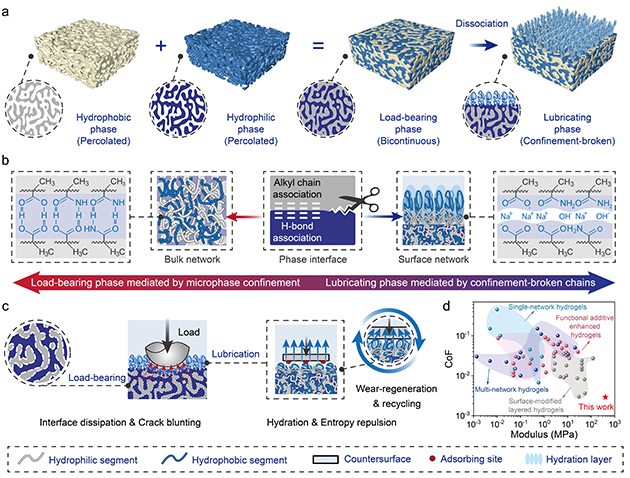 在人體關(guān)節(jié)中,軟骨依托多尺度膠原網(wǎng)絡(luò)、多相組分及其界面的協(xié)同作用,構(gòu)建出兼具高承載與超低摩擦的天然潤滑系統(tǒng)。基于這一特性,水凝膠作為有潛力的人工軟骨替代材料備受關(guān)注。然而,傳統(tǒng)潤滑水凝膠往往因結(jié)構(gòu)均一性而陷入兩難境地,提高整體網(wǎng)絡(luò)致密度雖能增強(qiáng)力學(xué)性能,卻會(huì)削弱表面水合與潤滑能力;單純追求低摩擦,又會(huì)使材料在高載荷下迅速變形、蠕變甚至失效。這種長期存在的性能權(quán)衡,嚴(yán)重制約了水凝膠在高載荷、長壽命潤滑場景中的實(shí)際應(yīng)用。